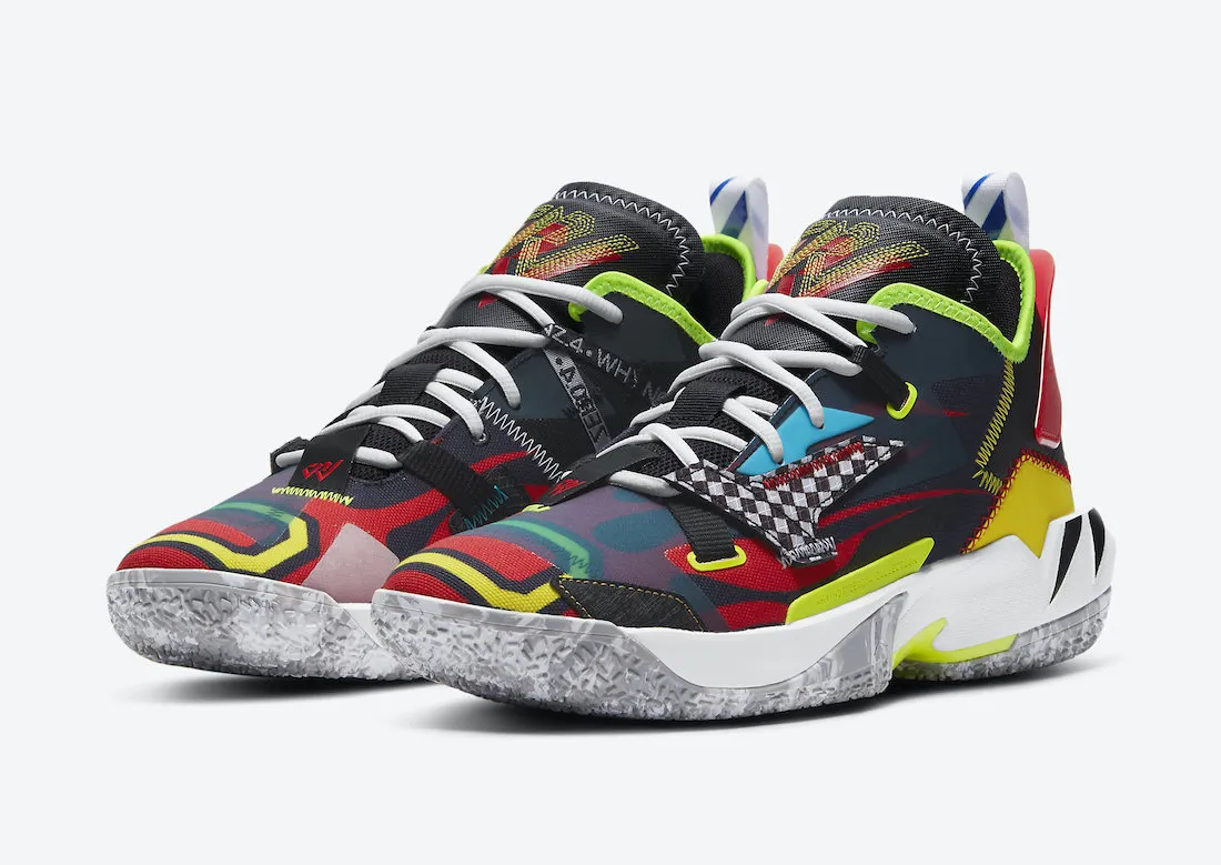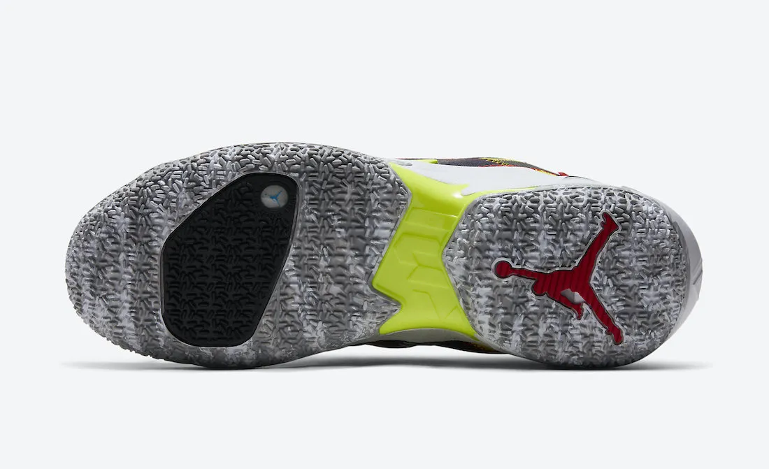 Là encore, l'assemblage de couleurs est hétéroclite en complément de la zone du talon, essentiellement noir et jaune. On note également la présence d'un motif à damiers au niveau de l'empeigne, un petit clin d’œil venant rappeler l'attrait de « Jordan Brand » envers les sports automobiles. Une semelle intermédiaire blanche et une semelle extérieure bicolore complètent le modèle qui sera disponible à hauteur de 130 dollars.