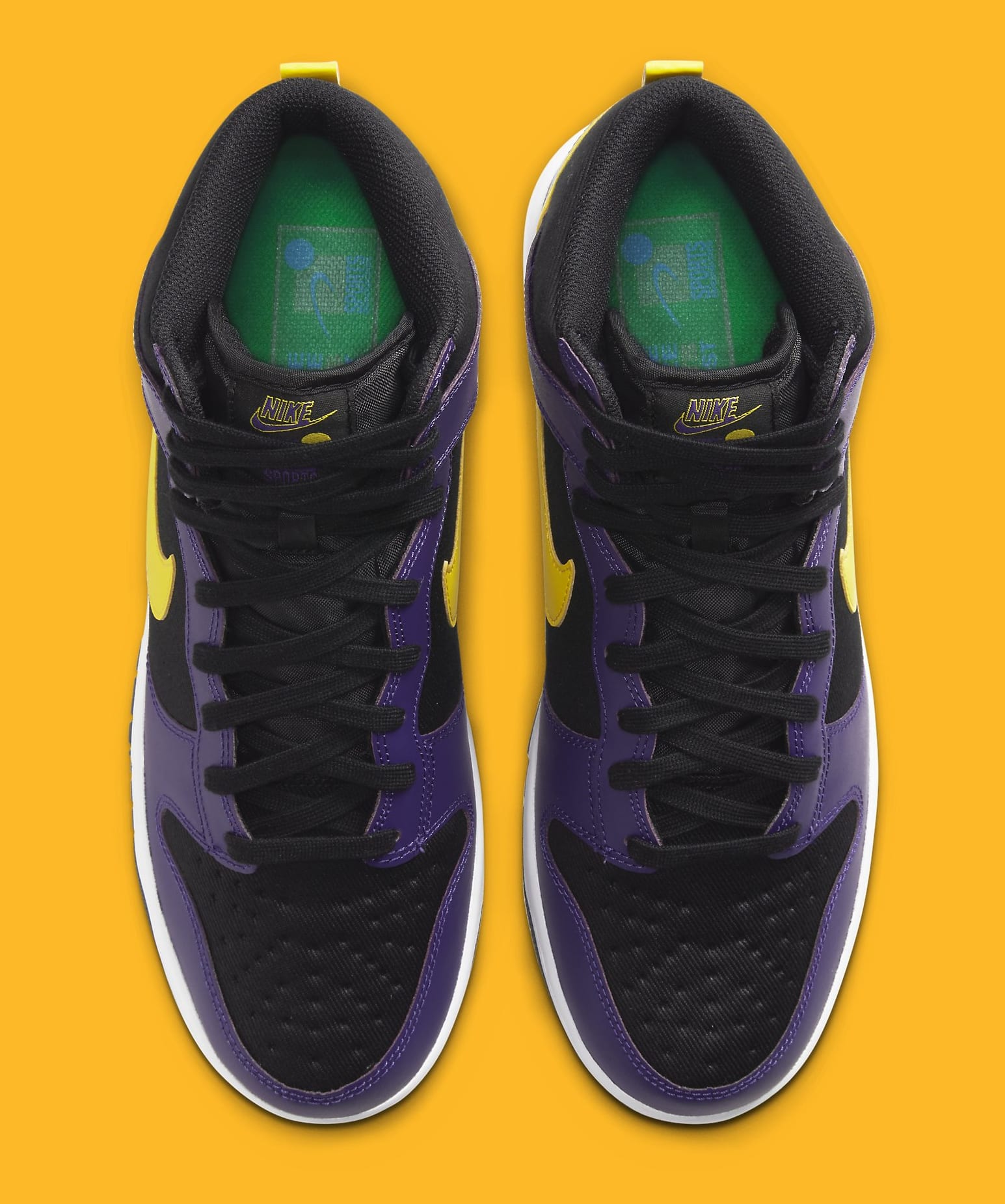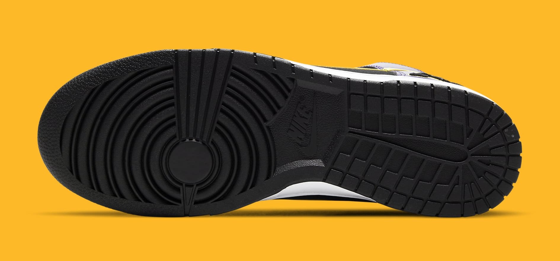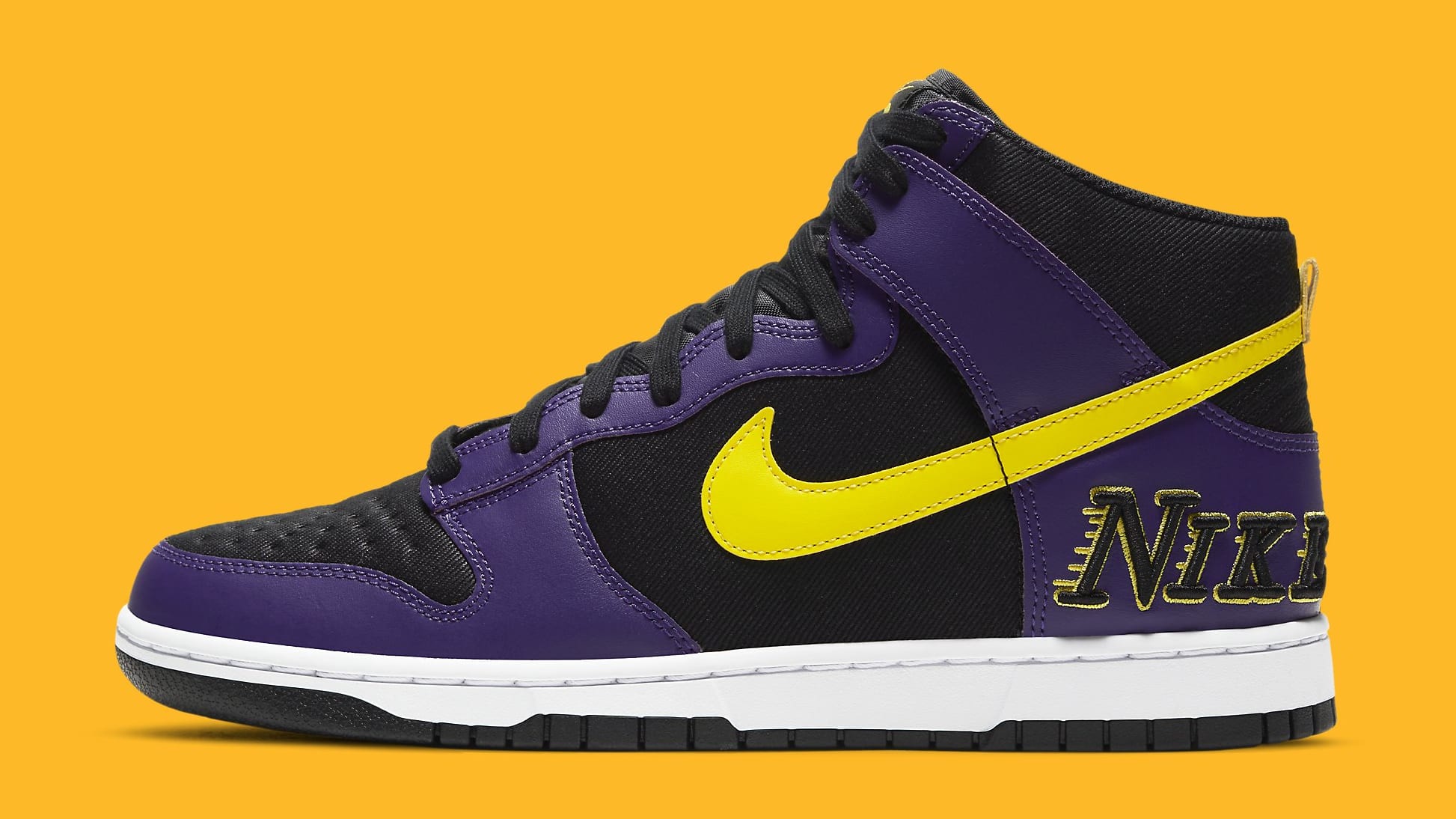 Après avoir dévoilé quatre coloris aux couleurs de tous les uniformes des Lakers de la « Nike Air Max 95 NRG », Nike continue d’honorer la franchise californienne avec une version « purple-and-gold » de sa « Dunk High ». Une version plus « purple » que « yellow » avec deux teintes de violet foncé, entre mesh et cuir, tranché par un signe Nike jaune. La marque Nike en « Signature Lakers » présente en relief au niveau du talon est également réussie.