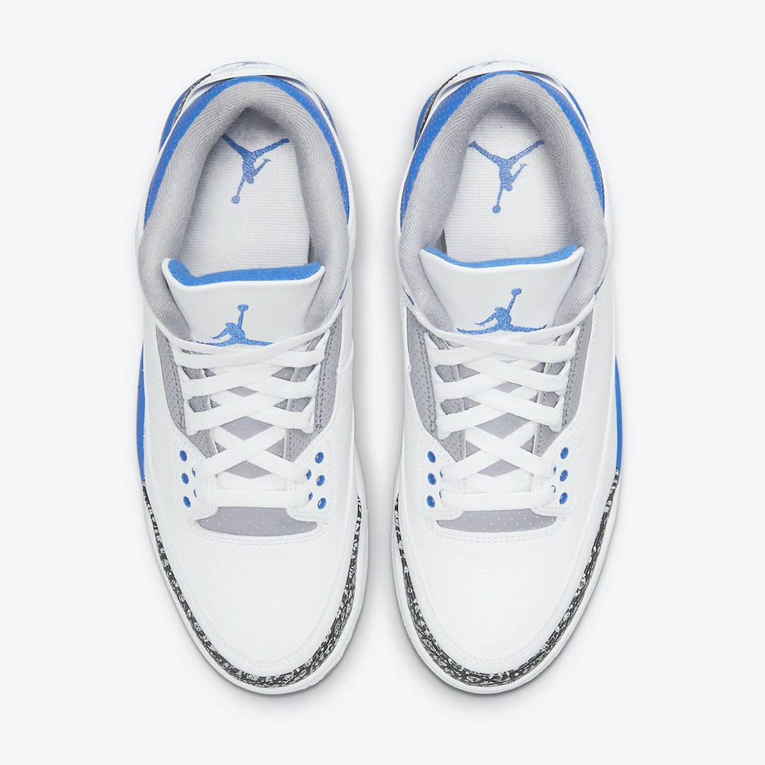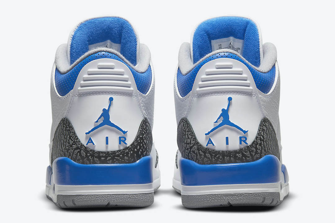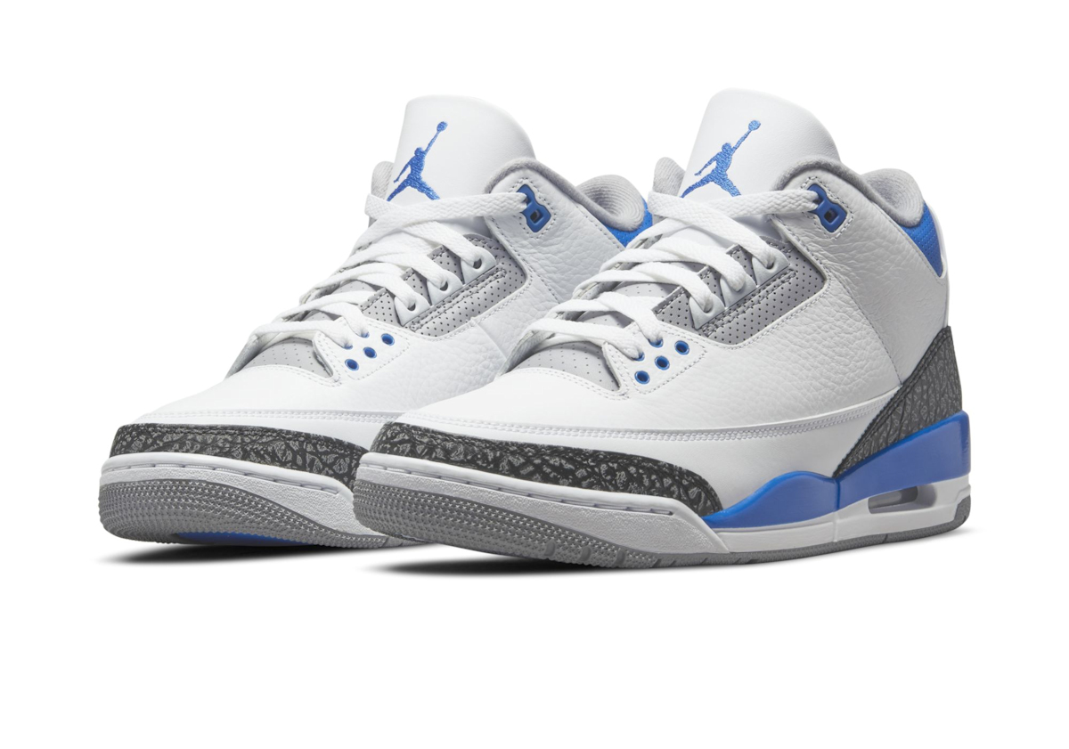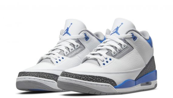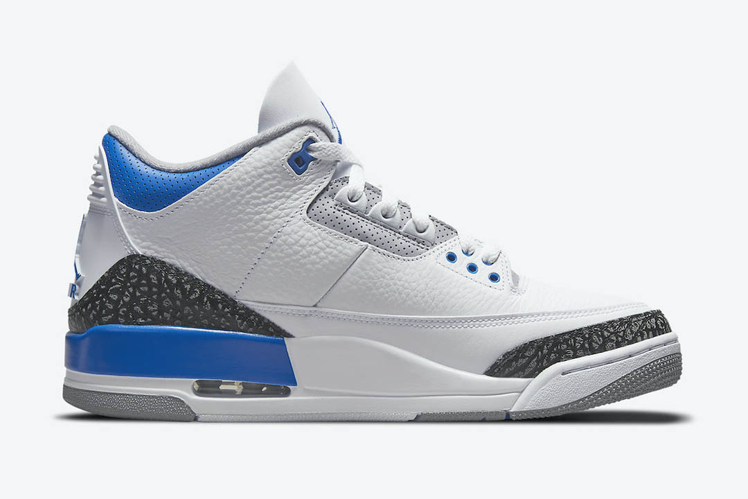L’indiscrétion est signée du compte Twitter US_11 qui a mis en ligne les premières images de la Air Jordan « Racer Blue », destinée à investir le marché à partir du 10 juillet prochain. Un modèle principalement composé de cuir blanc grainé, doté de trois coloris pour l’accompagner : du cuir perforé gris au niveau des lacets, l’imprimé « éléphant noir » qui parcoure le dessus de la semelle, blanche et grise.