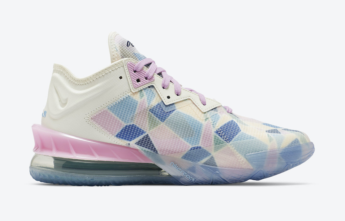 La tige, l’empeigne et l’avant de la chaussure sont recouverts d’une combinaison d’ivoire pâle, de rose arctique, de vert et de bleu « Leche » à travers des motifs géométriques. La semelle extérieure translucide à l’arrière et bleu glacé à l’avant complètent le modèle accentué au niveau du talon par un bande rose.