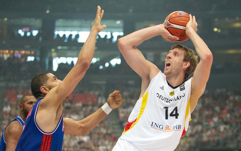 L’Allemand raconte ne pas avoir hésité longtemps lorsqu’on lui a proposé ce rôle honorifique. Quoi de plus logique pour lui, qui a pris part à pas moins de sept éditions de cette compétition internationale (1999, 2001, 2003, 2005, 2007, 2011 et 2015), dont une finale en 2005, perdue face à la Grèce. Une compétition dont il avait terminé meilleur marqueur, tout comme en 2001 et 2007.