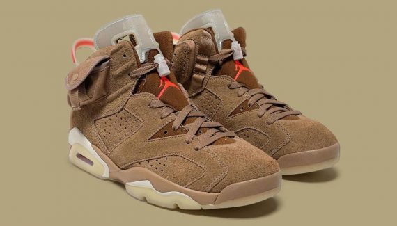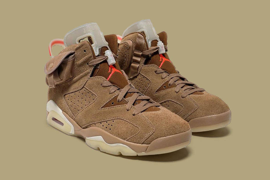 Dévoilée dans une story Instagram du rappeur, la nouvelle version de la Air Jordan 6 x Travis Scott change seulement de coloris principal, un « Kaki British », se rapprochant du marron clair avec des touches d’orange sur le logo et le talon. La semelle évolue aussi en blanc, blanc cassé et beige.