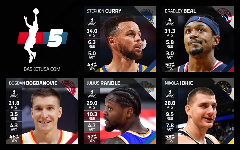 Pas facile de choisir le cinq majeur de la semaine. Avec son coup de chaud historique en avril, sur lequel il vient de battre le record de 3-points sur un mois, Stephen Curry est difficile à laisser de côté, malgré son match compliqué face aux Wizards. Le meneur des Warriors vient en effet d'effacer les 82 réussites de loin de James Harden, en novembre 2019, avec déjà 85 réussites en avril. Et il a encore deux matchs pour faire grimper le compteur…