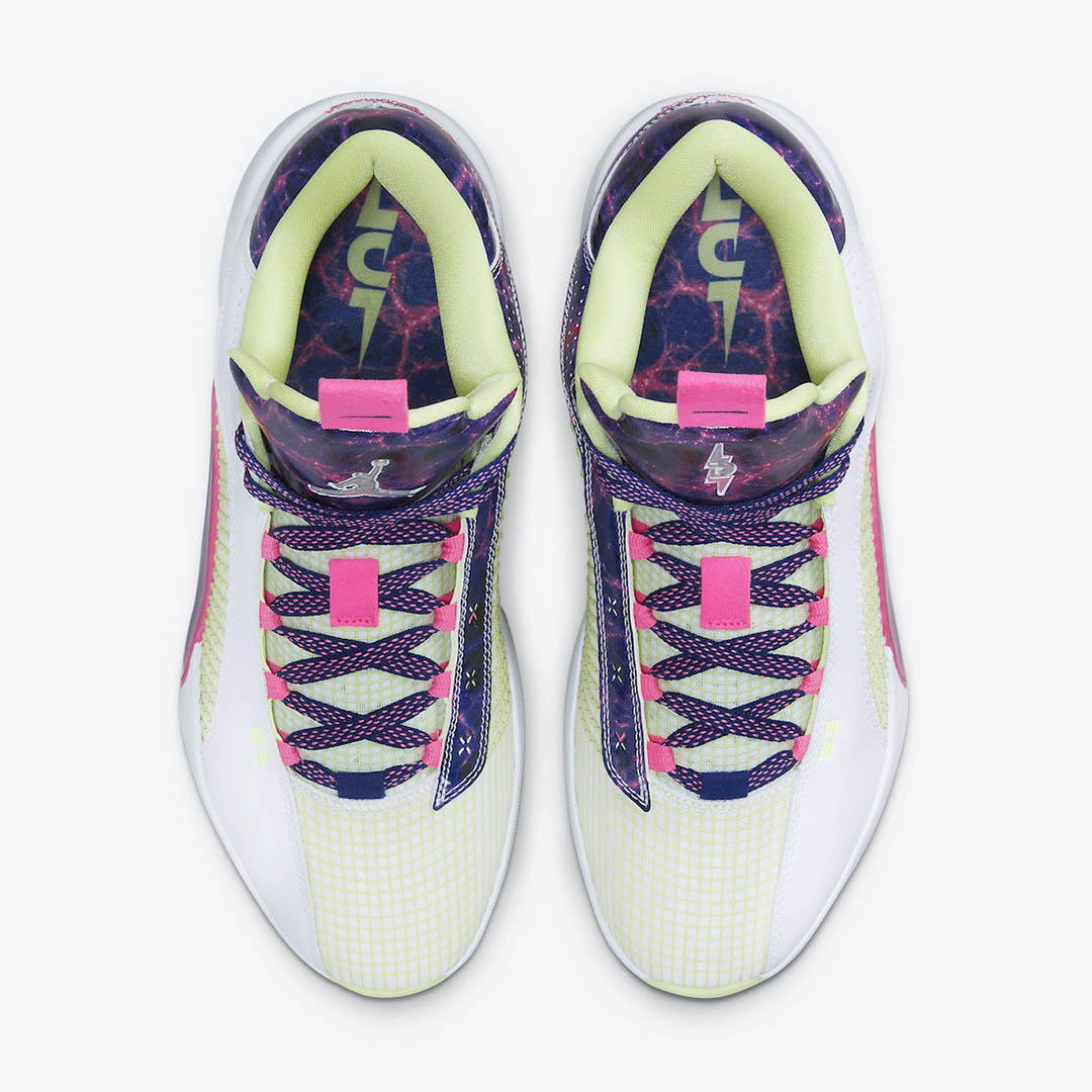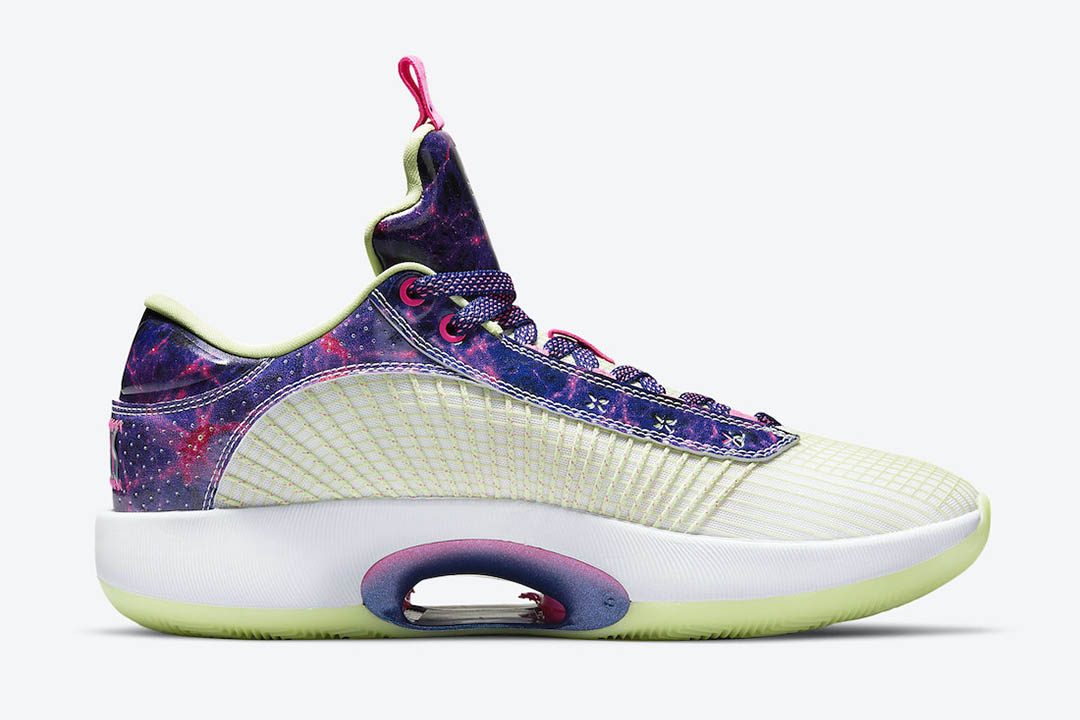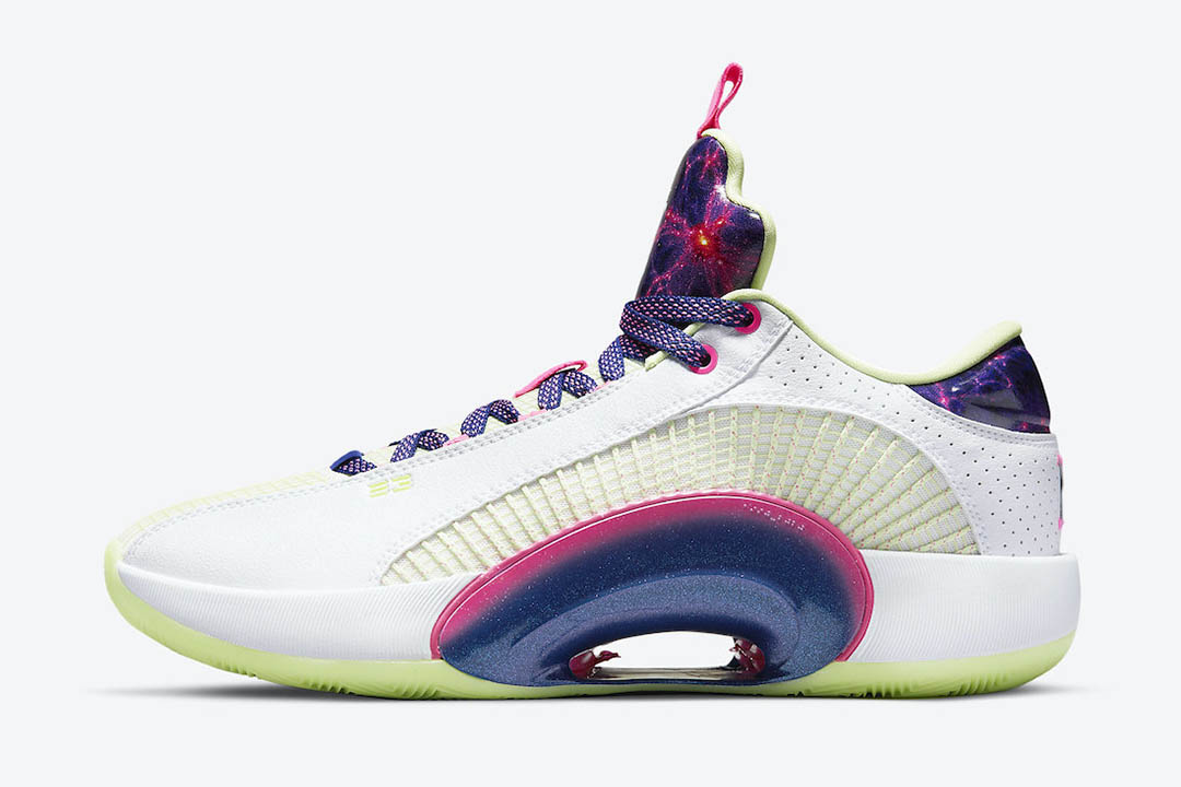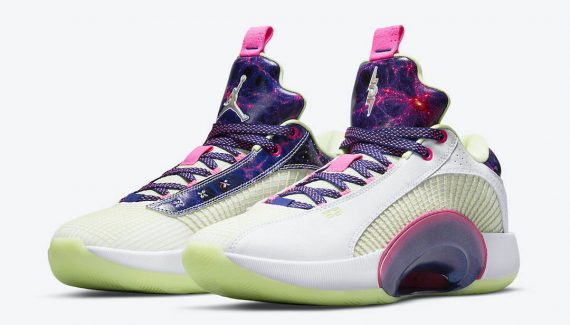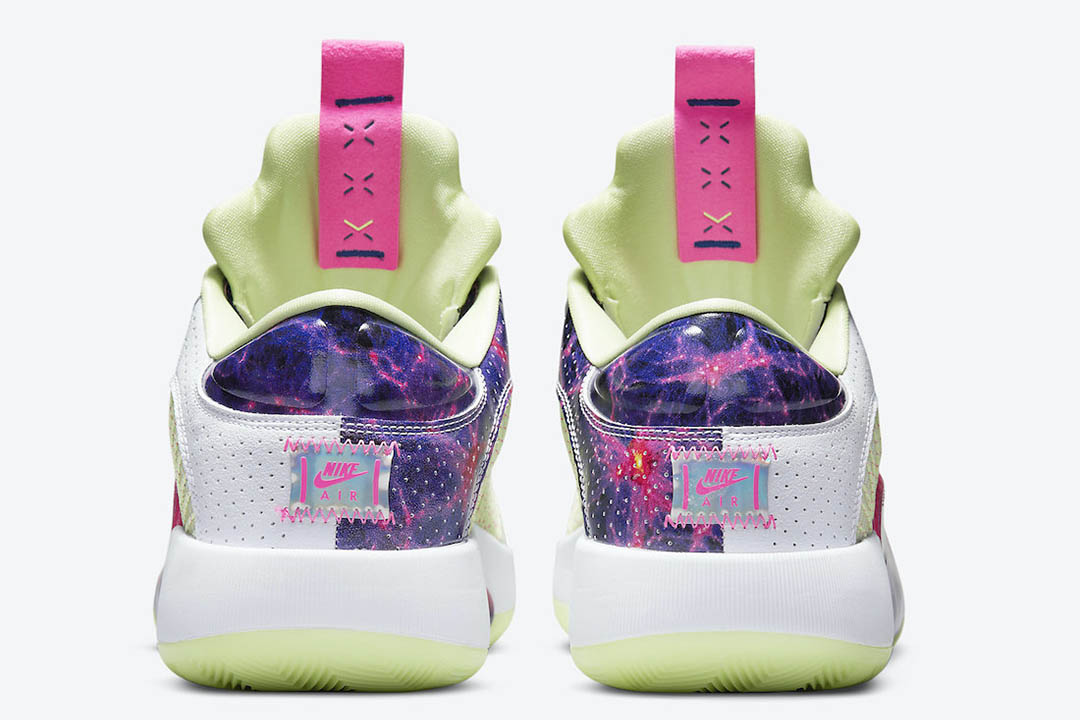 Pour le reste, la semelle intermédiaire, blanche et jaune pâle tandis que l’Eclipse Plate va du violet foncé au rose. Le logo de Luka Doncic est visible sur la languette de la chaussure gauche, celui de Jordan Brand sur l’autre chaussure.