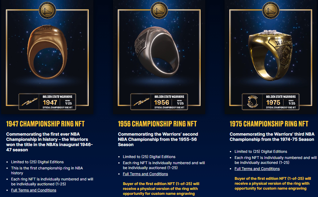 Pour cette première, les Warriors ont décidé de créer une version numérique de leurs différentes bagues de champion NBA, mais également de places de matches mythiques, comme celui face aux Grizzlies du 13 avril 2016. C’est ce soir là que Golden State avait remporté sa 73e victoire en saison régulière, effaçant le record des Bulls de Michael Jordan et Scottie Pippen. Au total, il y a donc 300 NFT disponibles.