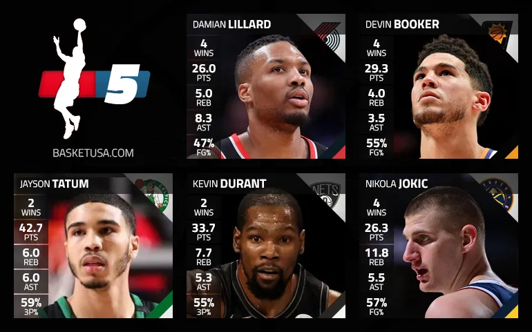 Sur les ailes, impossible de ne pas retenir Jayson Tatum et son record de franchise (égalé) à 60 points alors que Julius Randle, Michael Porter Jr, Zion Williamson, Jimmy Butler, Khris Middleton ou Giannis Antetokounmpo pouvaient également faire acte de candidature. Toutefois, même s'il a raté un match face à Portland, c'est Kevin Durant qu'on choisit, toujours aussi facile avec ses deux matchs consécutifs à 42 points.