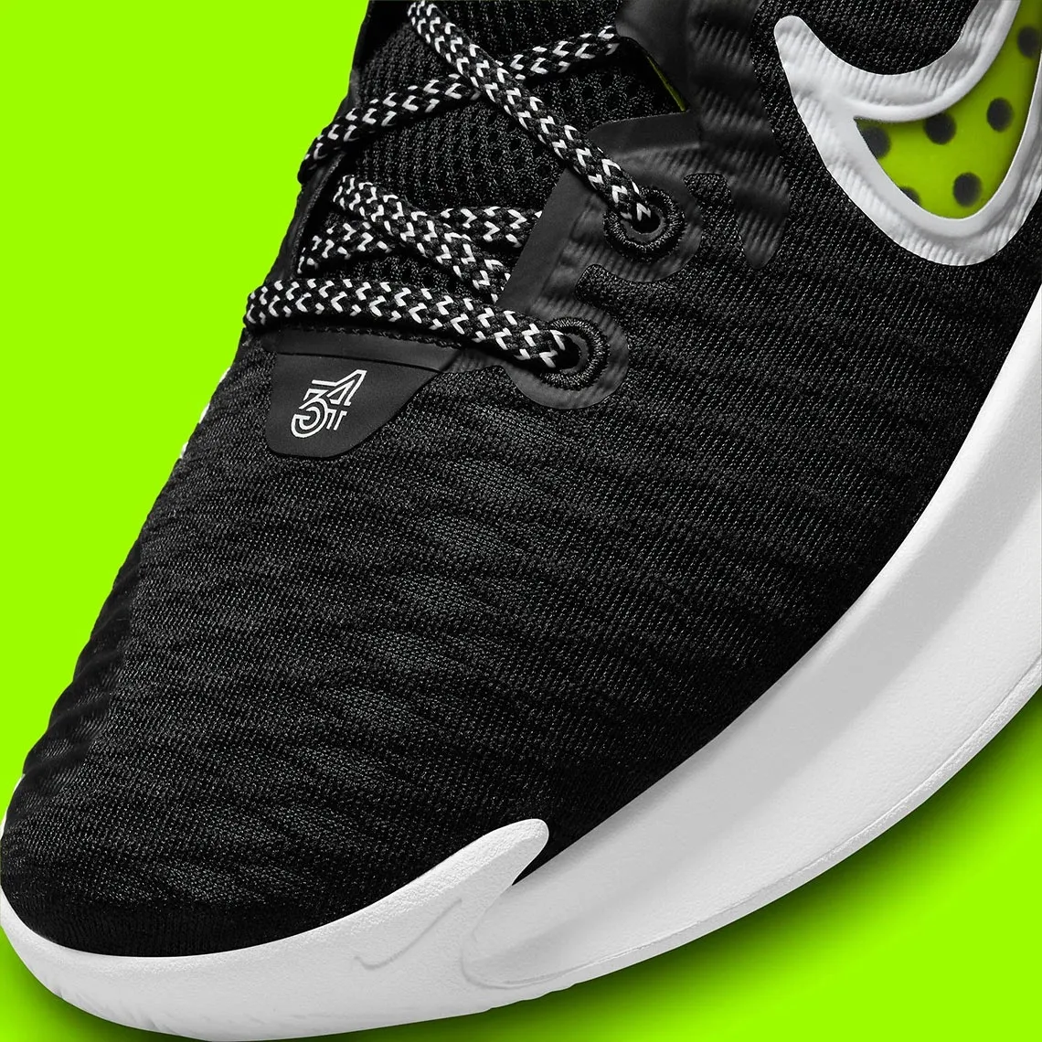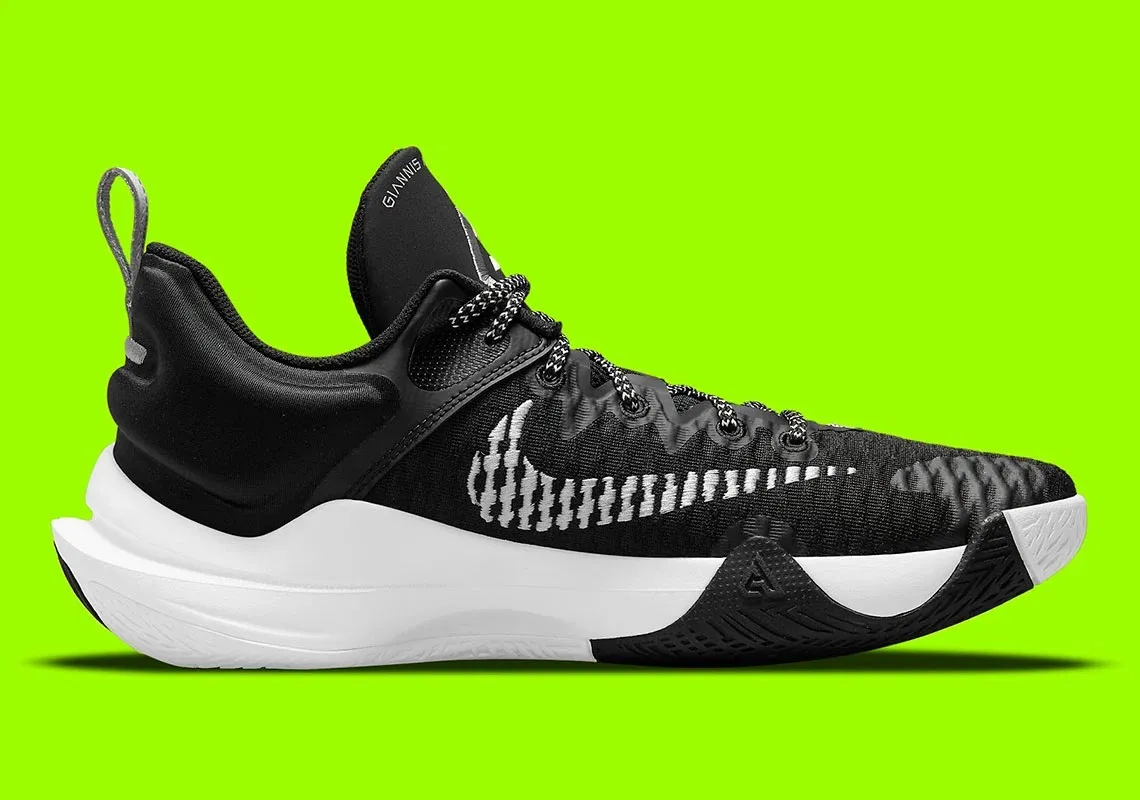 Premièrement apparue sous un modèle quasiment entièrement noir, la Nike Giannis « Immortality » continue de se dévoiler avec un nouveau coloris foudroyant. Avec une empeigne toujours dominée par du noir mais cette fois le signe Nike en « Volt » d'un côté et blanc et noir de l'autre, ainsi que la semelle intermédiaire quasiment blanche pour assurer le contraste et donner à l'ensemble un nouvel effet plutôt réussi.