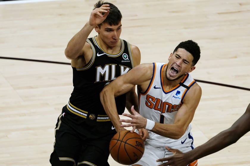 Dans le second quart-temps, les deux équipes continuent de faire jeu égal en dégainant dès que possible, de loin comme de près. Mais les adresses retombent enfin et les Hawks, qui vont chercher leurs points à mi-distance ou près du cercle, en profitent pour distancer avec leur « second unit » des Suns trop dépendants de leur réussite à 3-points (56-46). Le retour en jeu de Devin Booker permet alors à Phoenix d’initier un 10-0, pour relancer le mano-a-mano avec Atlanta, plus collectif. L’agressivité de Trae Young et Bogdan Bogdanovic remet cependant les locaux en tête d’une possession, à la pause (67-65).