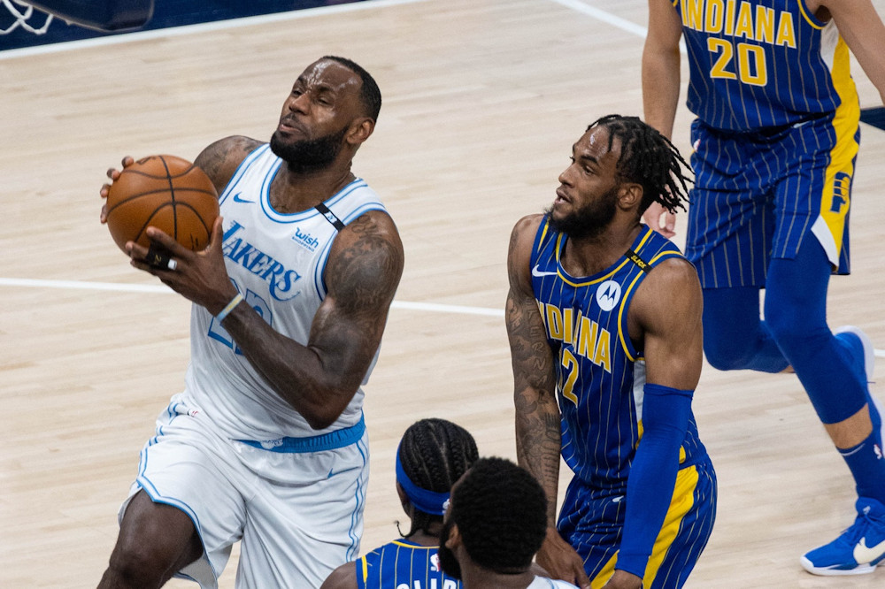 Comme annoncé par Frank Vogel, les Lakers présentent leur cinq type avec LeBron James et Dennis Schroder, tandis que les Pacers débutent avec leur cinq « bis » puisque Domantas Sabonis reste assis sur le banc avec Malcolm Brogdon et Myles Turner. Évidemment, les yeux sont braqués sur LeBron James, et tout va bien. Un petit stepback après un enchaînement de dribbles, puis surtout ce gros alley-oop en contre-attaque.
