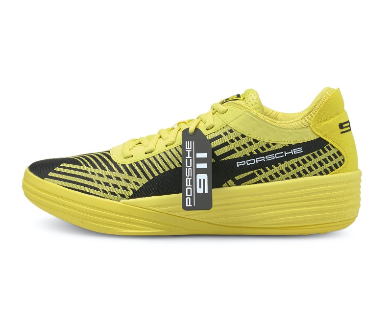 Puma a envoyé la gomme pour la nouvelle version de sa « Clyde All Pro » en dévoilant une collaboration avec Porsche ! Les deux marques allemandes ont uni leur savoir-faire pour sortir une paire censée refléter une sensation de vitesse, avec une tige jaune néon brillante, couleur qui compose les mêmes bandes sur la chaussure, sur un fond noir.