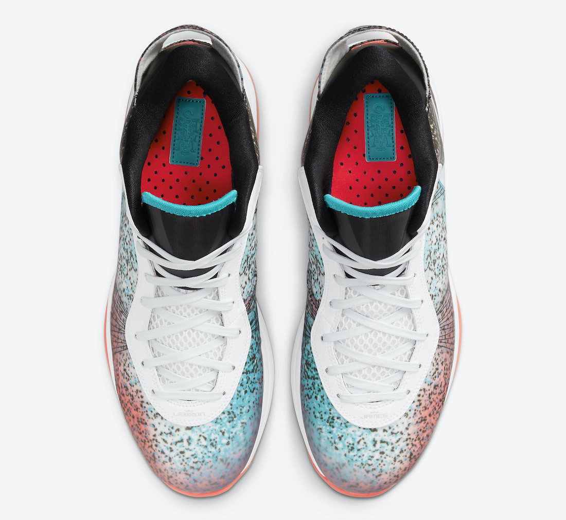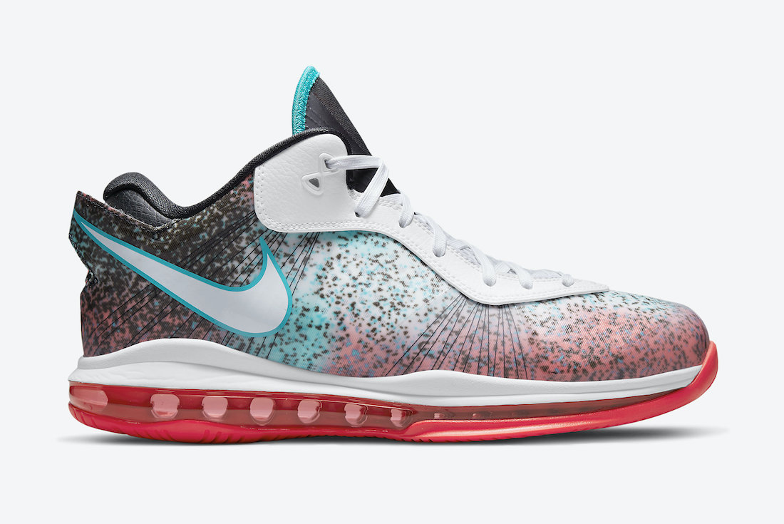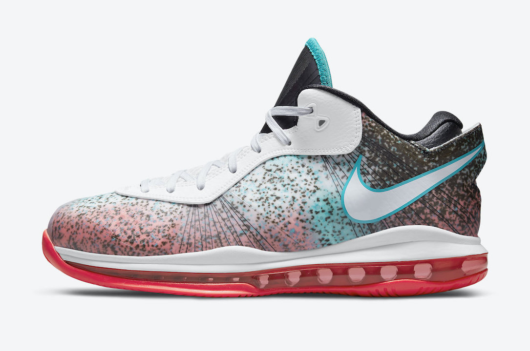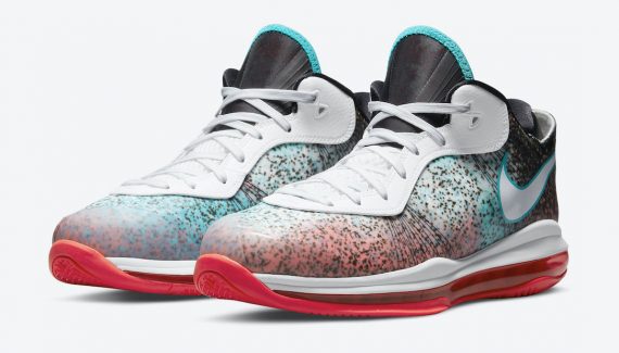 Après le retour de la LeBron 8 V2 Low « Sprite », c’est le modèle « Miami Nights » de la version basse de LeBron 8 V2 qui s’apprête à réinvestir le marche. Le modèle rétro reprend le design de 2011 avec un modèle graphique alliant fond alliant rouge, blanc, bleu et noir, le tout, tacheté de noir, étant censé refléter la vie nocturne de Miami. Le dispositif Air Max est présent en rouge sous la semelle intermédiaire, blanche.