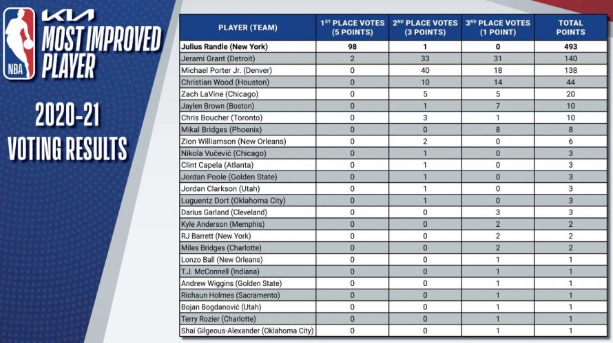 Sous les ordres de Tom Thibodeau, qui voit un autre de ses poulains être élu MIP, après Jimmy Butler en 2015, Julius Randle a explosé avec New York. Initialement mentionné dans des rumeurs de transfert, l’ancien intérieur des Lakers et des Pelicans est finalement resté à « Big Apple », où il est passé de 19.5 points, 9.7 rebonds et 3.1 passes de moyenne en 2019/20, à 24.1 points, 10.2 rebonds et 6.0 passes de moyenne en 2020/21.