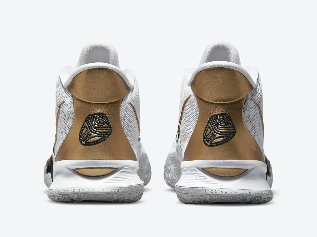 Bien visible en noir sur fond « or métallique » au niveau du talon, le dessin d'une bague faisant référence à celle distribuée aux champions NBA. Le logo Nike sur l'empeigne et celui de Kyrie Irving sur la languette ressortent également en or. La semelle intermédiaire est noire, la semelle extérieure rainurée est quant à elle en gris.