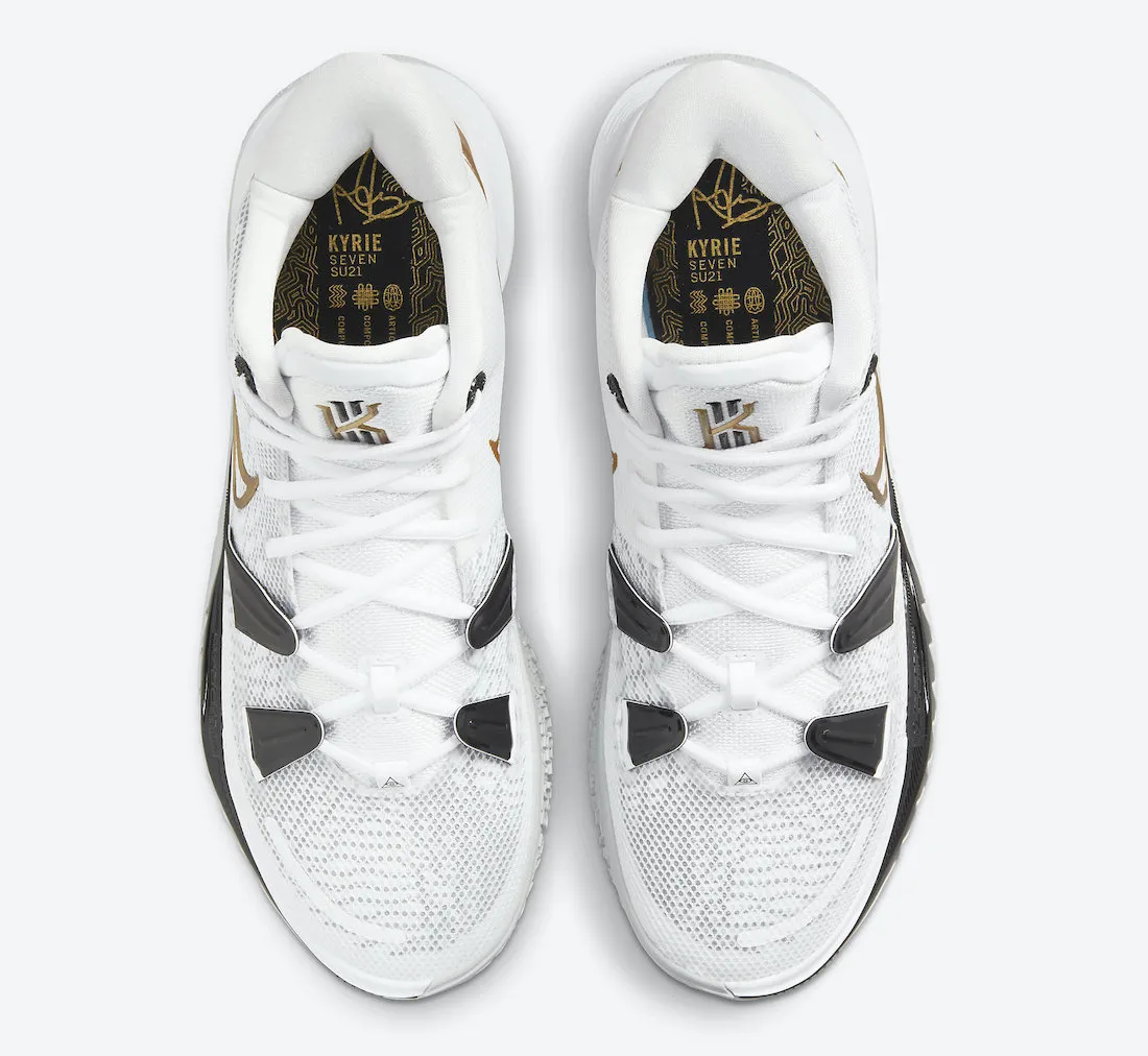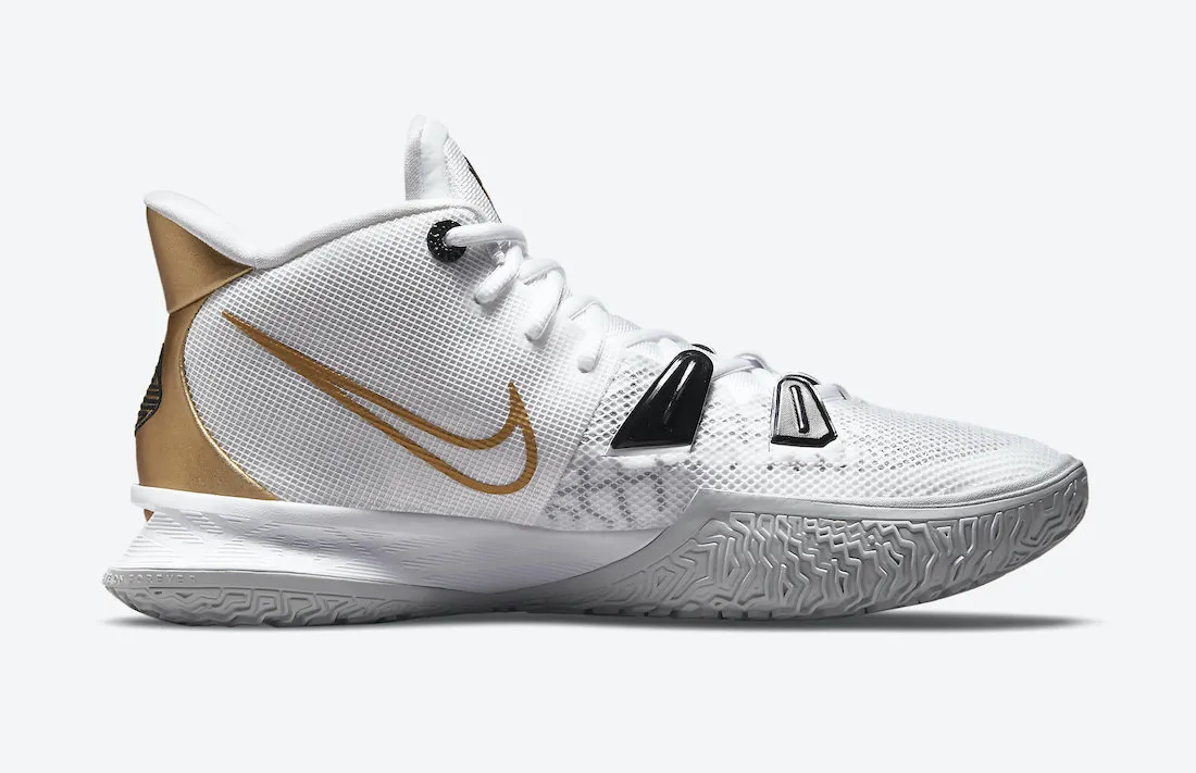 La marque à la virgule aurait-elle anticipé la participation des Nets en finale NBA avec une Kyrie 7 parée d'or ? Si Brooklyn est encore en course à ce stade, Kyrie Irving aura en effet tout le loisir de porter cette nouvelle déclinaison, avec une base à dominante blanche et grise en mesh superposée de couches de noir et d'or.