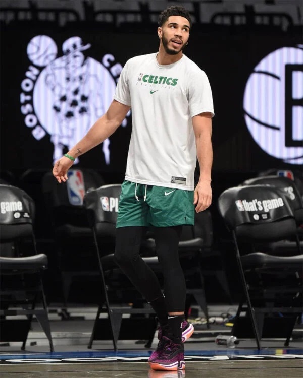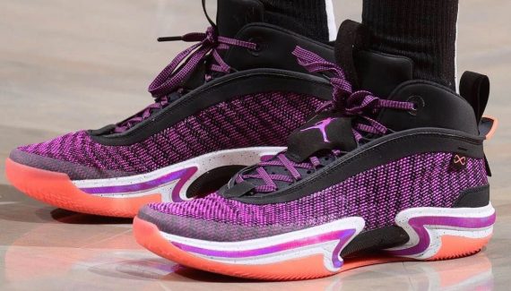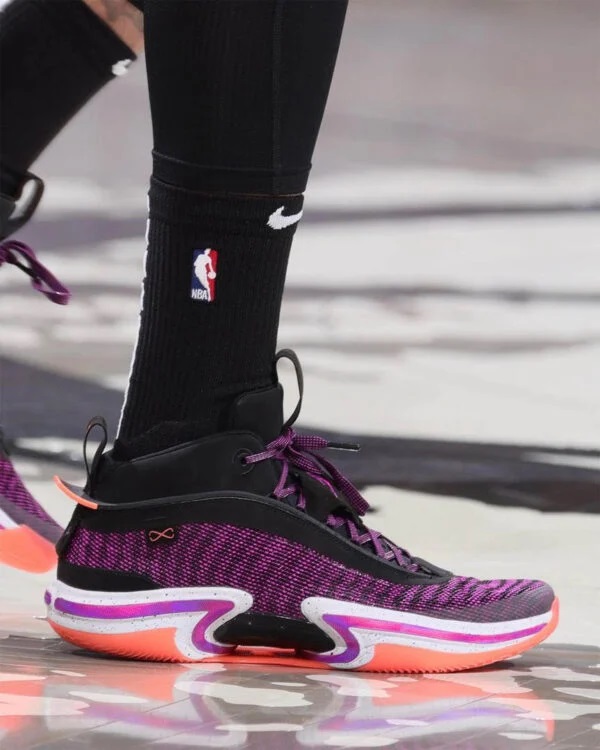 Sur les quelques clichés disponibles de Jayson Tatum avec la AJ 36 aux pieds, on peut voir une maille magenta et ce qui semble être une tige Durabuck noire près de la languette et du col. Le point fort de la conception de cette paire résiderait dans la troisième génération de la plaque Eclispe pour accompagner l’unité Zoom Air.