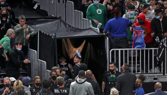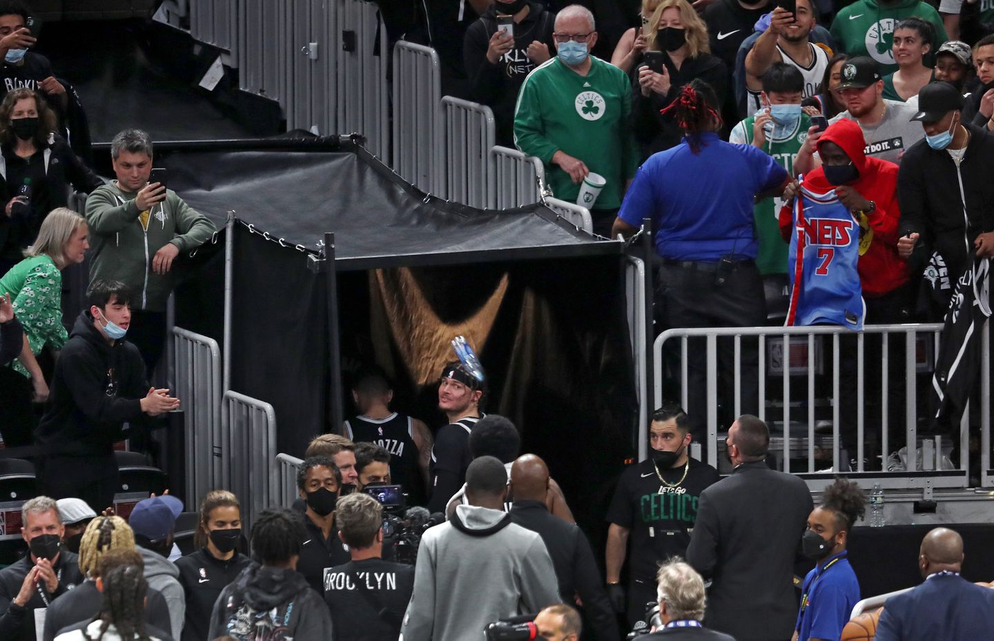 Les incidents de la semaine dernière et les suspensions de spectateurs n’ont pas calmé tout le monde et, cette nuit, un fan des Celtics a balancé une bouteille sur Kyrie Irving au moment où ce dernier rejoignait les vestiaires après la victoire des Nets. Un geste inadmissible qui s’est terminé avec l’intervention du personnel de sécurité pour passer les menottes à un homme qui portait le maillot de Kevin Garnett.