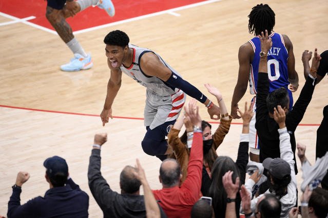 Alors que Davis Bertans rejoint Joel Embiid aux vestiaires, Rui Hachimura élève son niveau de jeu. Mais il écope aussi d’une faute technique à cause d’une réaction un peu trop agressive après son dunk. Sa hargne déteint sur ses coéquipiers, et Bradley Beal donne 12 longueurs d’avance après un quart-temps marqué par l’entrée sur le parquet d’un spectateur !