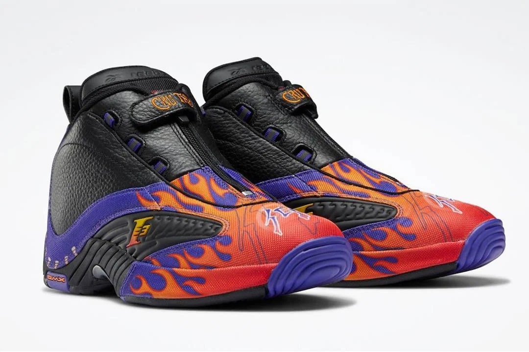Reebok avait déjà doté sa Question Mid d’un modèle « Motorsports ». Cette fois, c’est à la Answer 4 d’opérer un retour aux stands pour être “pimpée” sur le même thème du sport auto. Celui ressort particulièrement avec une imitation « hot rod » de flammes et une bande violette qui parcoure la chaussure, majoritairement noire, sur sa longueur.