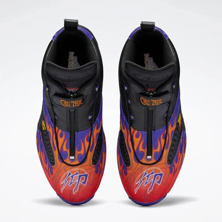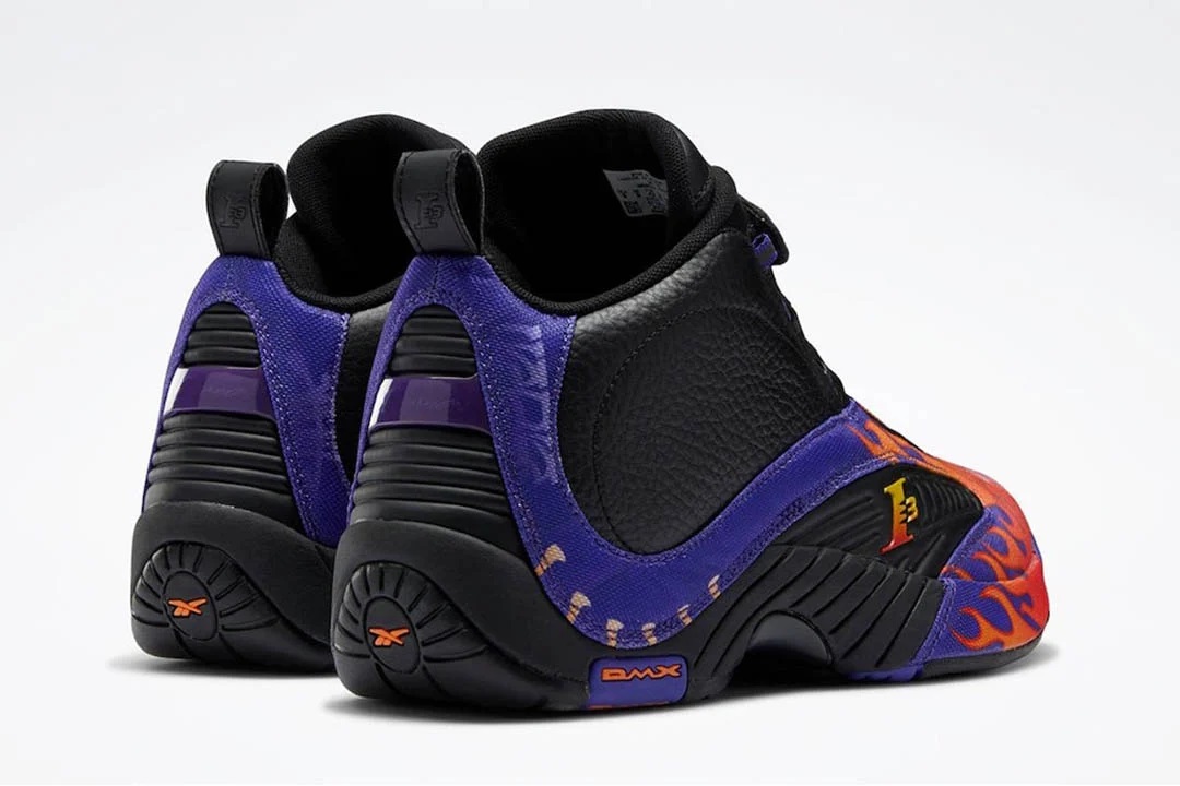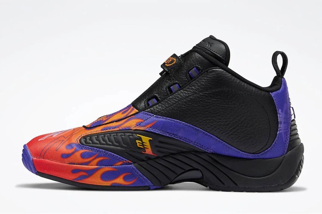 Reebok avait déjà doté sa Question Mid d’un modèle « Motorsports ». Cette fois, c’est à la Answer 4 d’opérer un retour aux stands pour être “pimpée” sur le même thème du sport auto. Celui ressort particulièrement avec une imitation « hot rod » de flammes et une bande violette qui parcoure la chaussure, majoritairement noire, sur sa longueur.