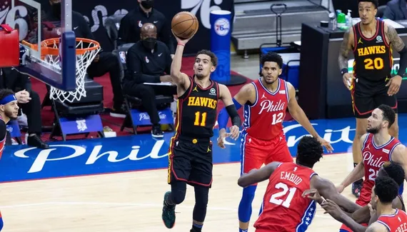 Dans un Wells Fargo Center très bien garni, les deux équipes proposent un début de match de qualité avec 80% de réussite sur les six premières minutes. Défendu par Danny Green, Trae Young assure la distribution pour ses intérieurs tandis que Bogdan Bogdanovic (21 points) règle la mire de loin. Présent et titulaire, Joel Embiid montre des signes rassurants physiquement en allant au contact sur Clint Capela et il offre une alternative à la réussite extérieure de Seth Curry (21 points).