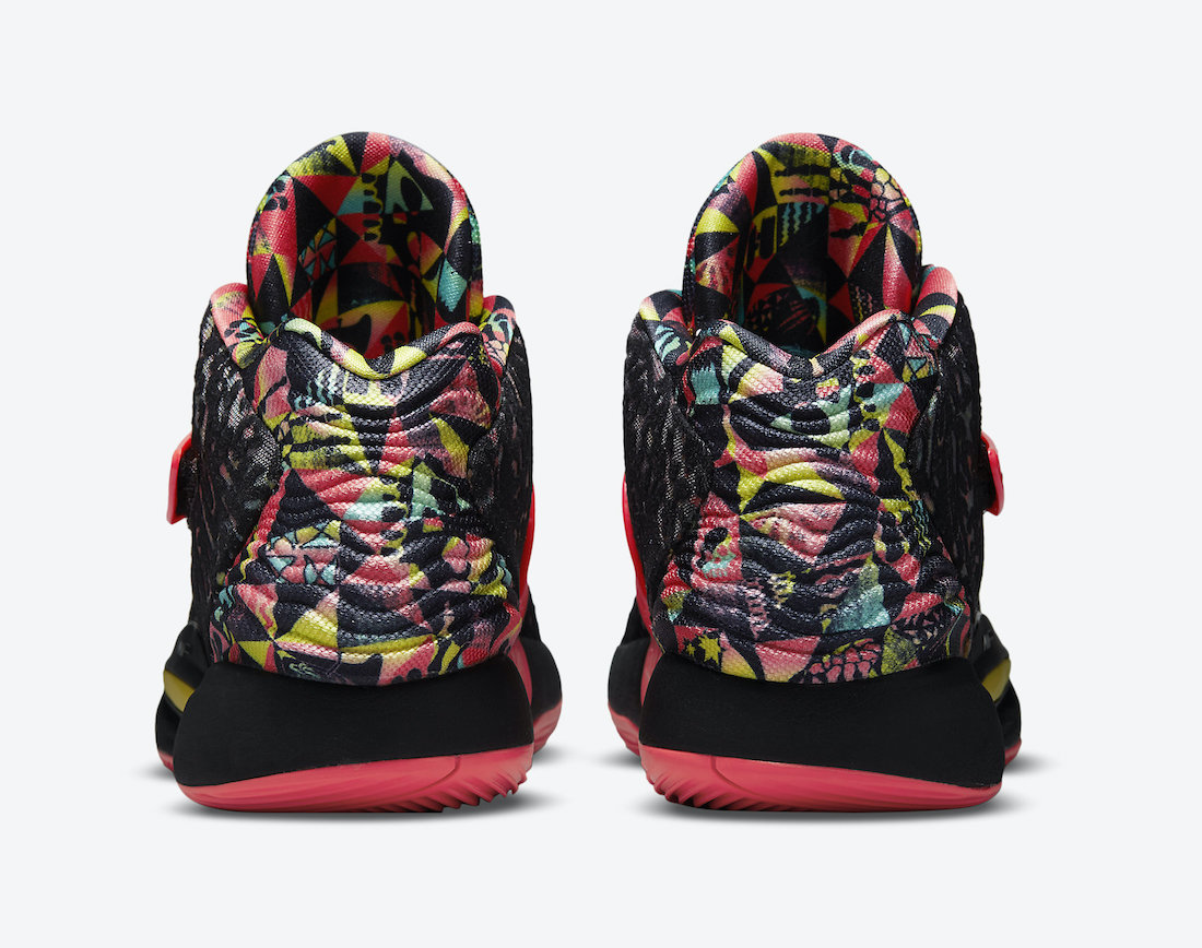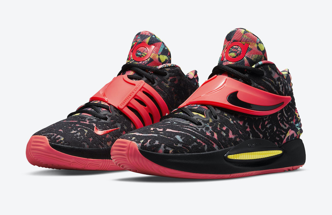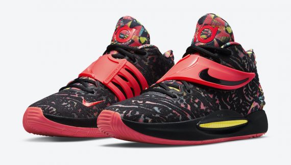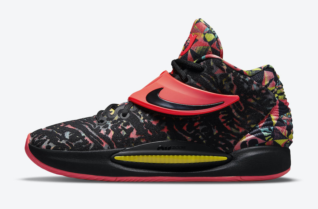 Disponible depuis le 5 juin pour 150 euros, la KD 14 « Ky-D » est dotée d’une unité Zoom Air strobel sur toute la longueur d’une semelle en rouge et noir et qu’on peut apercevoir en Volt. Moins cher (140 euros), la Kyrie 7 “Ky-D” est inspiré de la KD 4 “Weatherman” sortie en 2011.