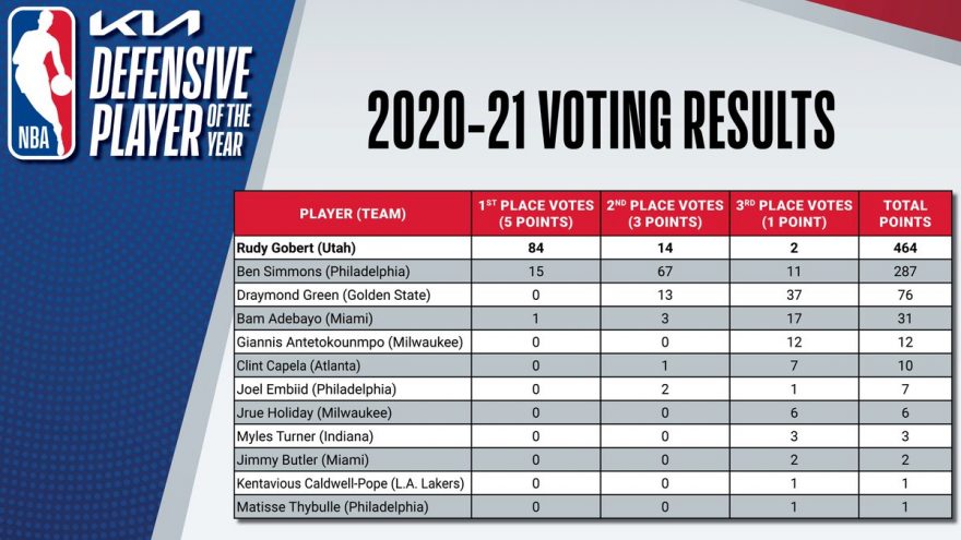 Dépossédé de son trophée par Giannis Antetokounmpo en 2020, Rudy Gobert (464 points, dont 84 premières places) n’a cette fois-ci pas laissé de place au doute, puisqu’il termine largement en tête, devant Ben Simmons (287 points, dont 15 premières places) et Draymond Green (76 points). Quatrième, Bam Adebayo (31 points) a hérité de l’autre première place manquante.