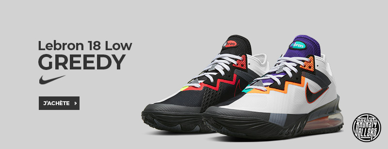 Procurez-vous maintenant sur Basket4Ballers.com les Nike Lebron 18 Low “Greedy” avec un nouveau coloris inspiré de l’héritage Air Max combiné aux technologies Max Air et Nike React pour permettre à Lebron de dominer le jeu.
