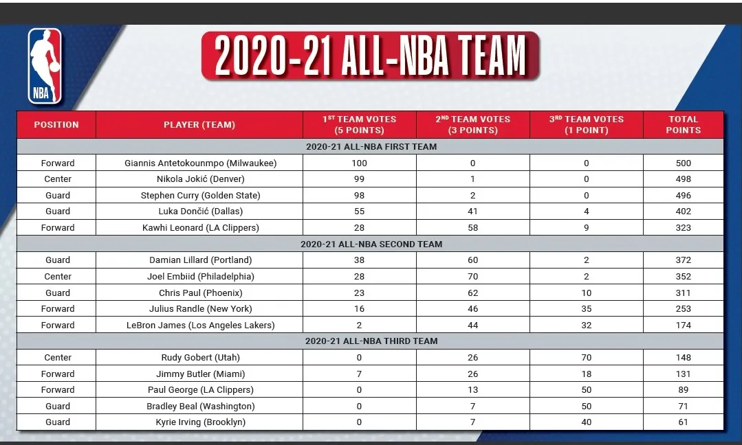 MVP 2021, Nikola Jokic décroche, sans surprise, une place dans la First All-NBA Team, et il est accompagné par un quatuor de choix avec Stephen Curry et Luka Doncic sur le “backcourt”, ainsi que Kawhi Leonard et Giannis Antetokounmpo sur le “frontcourt”. Un coup d’œil sur les votes nous montre que seul Giannis Antetokounmpo fait l'unanimité avec 100 voix sur 100 possibles. Nikola Jokic fait 99 sur 100, et Stephen Curry 98.