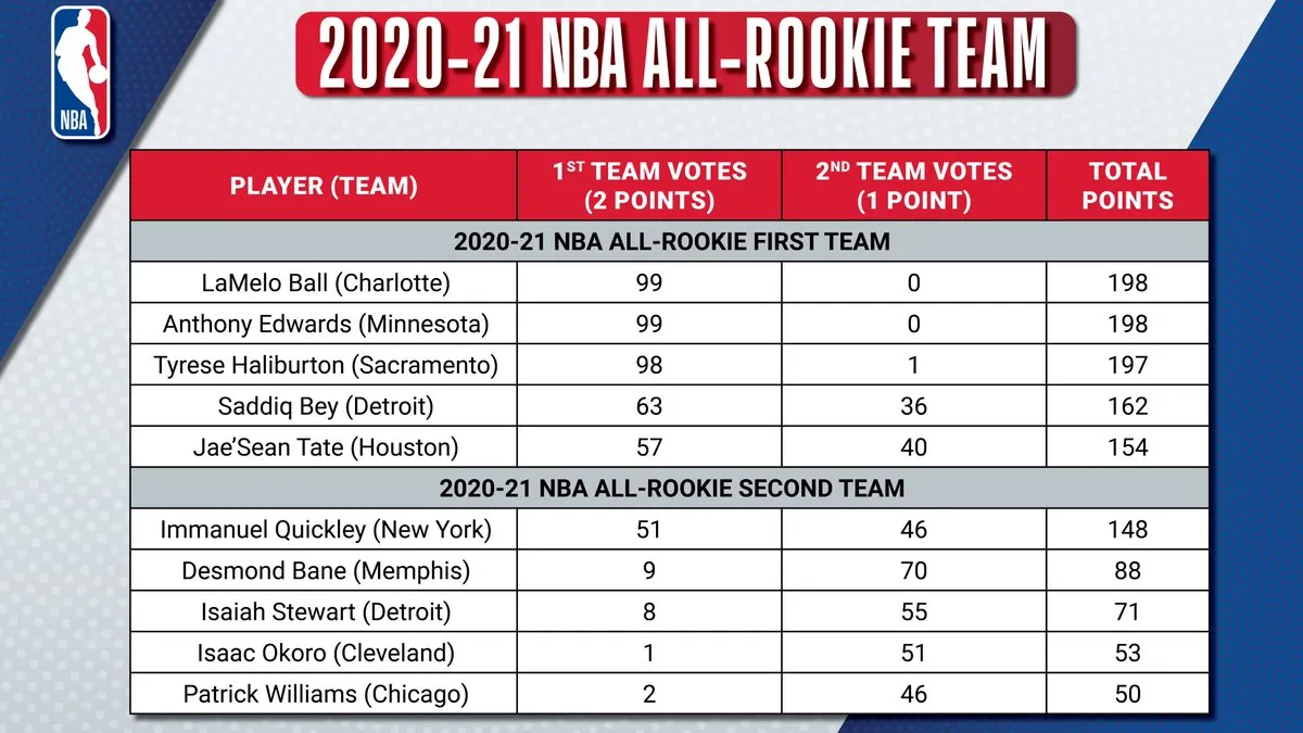 Parmi les absences notables, on note celles d'Anthony Cole (Magic) et de Théo Maledon (Thunder). Le Français obtient 5 voix dans la All-Rookie Second Team. Il est très loin des 50 points de Patrick Williams.
