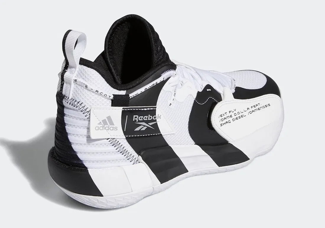 Aux côtés des logo des deux équipementiers acollés au niveau de l'empeigne, on retrouve l'inscription rappelant une collaboration entre deux basketteurs de talent mais aussi deux rappeurs : « Dame D.O.L.L.A. Feat Shaq Diesel / Damenosis ». A noter également que le noir et blanc se prolonge sur les semelles intermédiaires et extérieure, avec du bleu clair pour soigner le look, sous la chaussure !