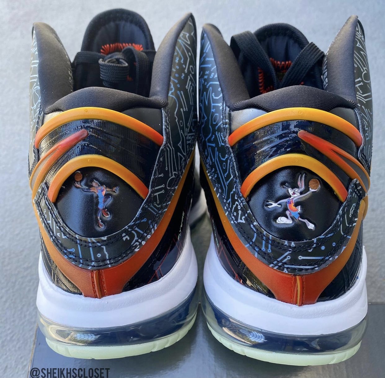 Toujours dans le coup, la LeBron 8 ne pouvait pas manquer l’événement avec la sortie du nouveau Space Jam pour se faire une nouvelle beauté. Sur ce modèle aux accents « futuristes », on trouve une tige noire, motifs inspirés de l’univers numérique dans lequel LeBron James va se retrouver dans le film, ainsi que des bandes dégradées d’orange. Les coloris des œillets supérieurs empruntent le même dégradé, comme pour orner la virgule présente sur l’empeigne (un autre figure en noir sur l’avant de la chaussure.
