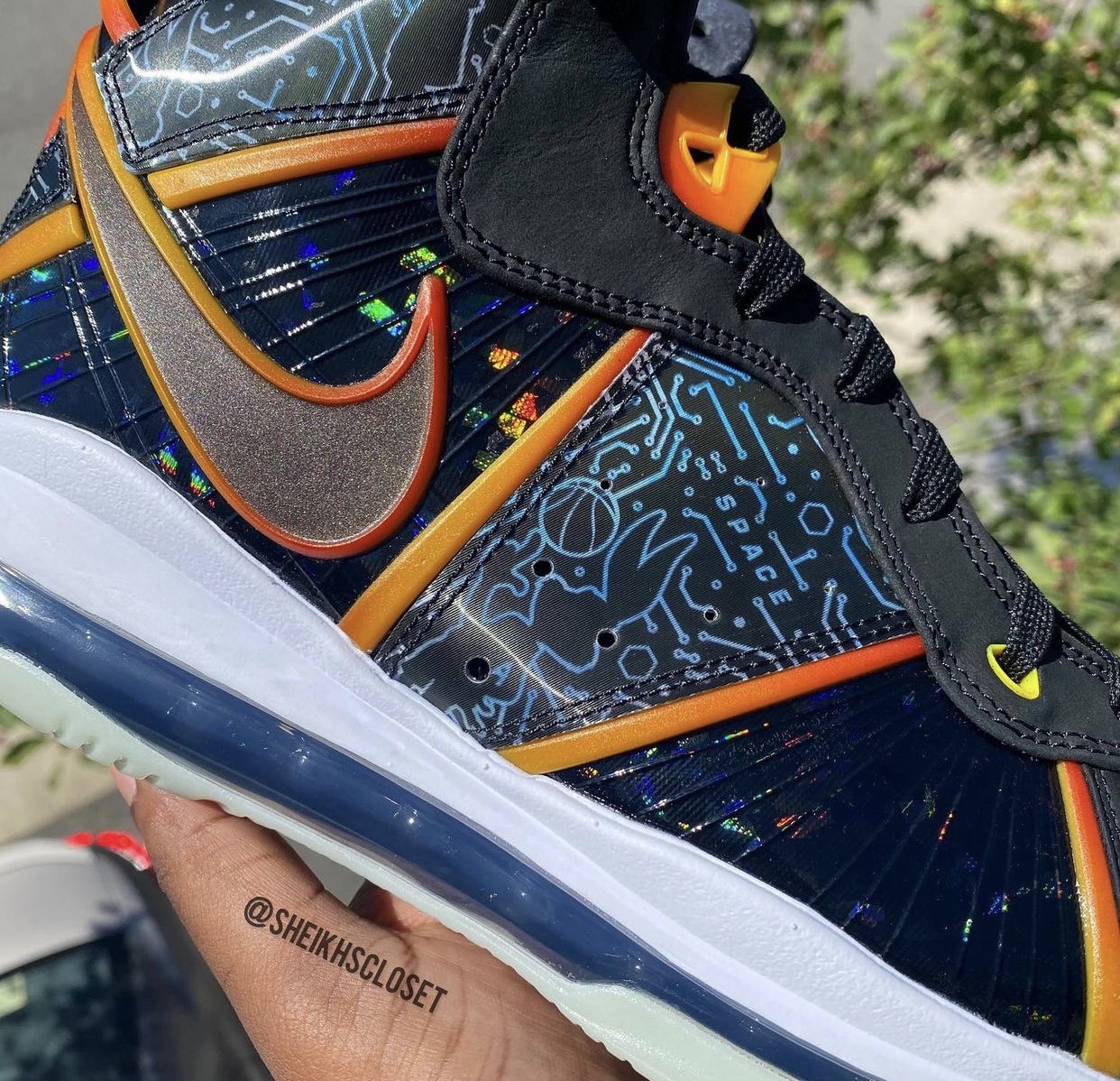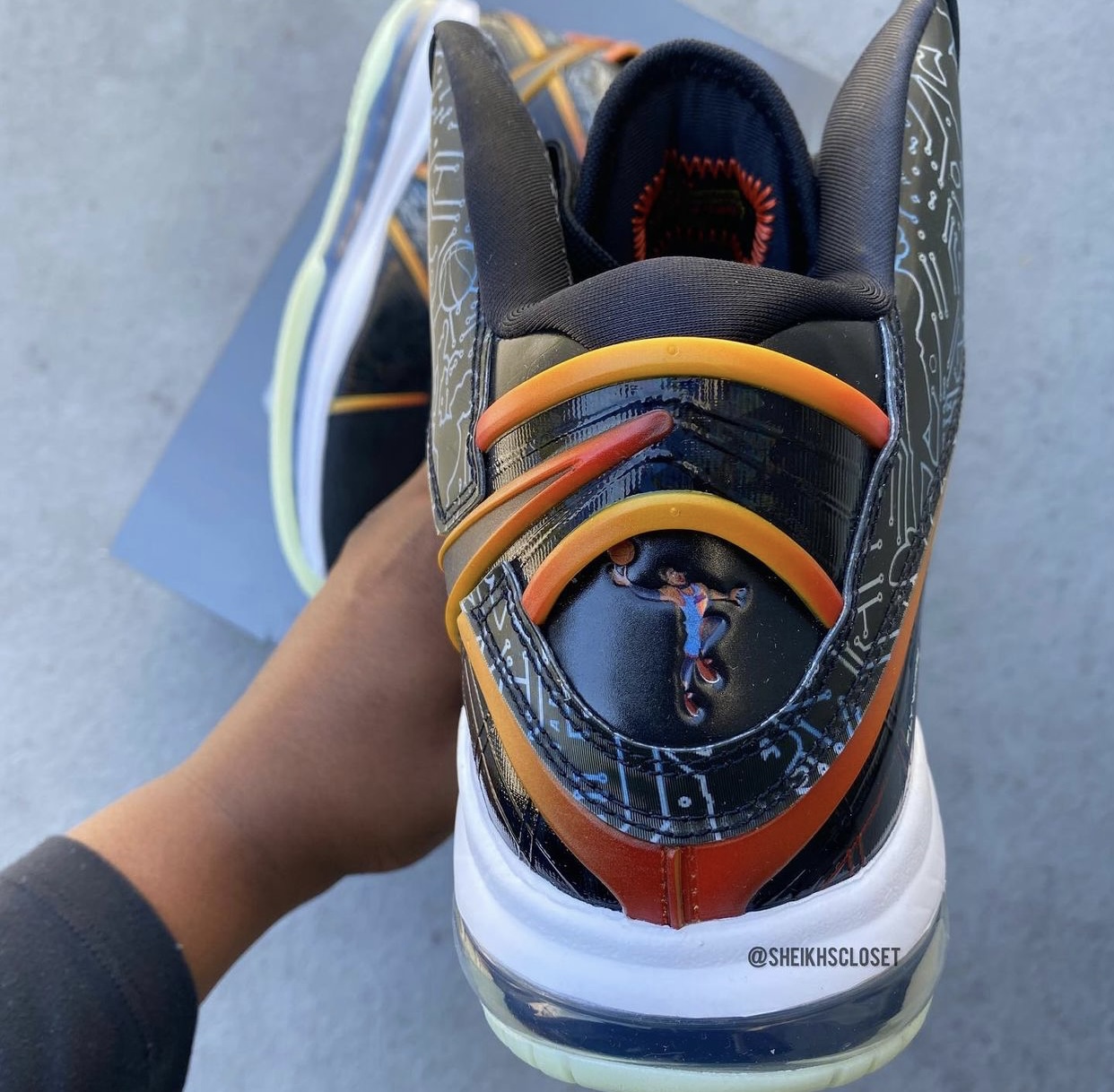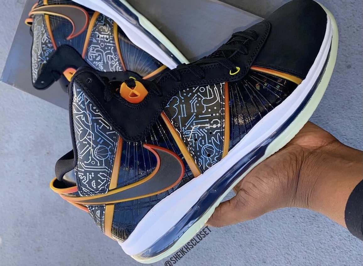 Toujours dans le coup, la LeBron 8 ne pouvait pas manquer l’événement avec la sortie du nouveau Space Jam pour se faire une nouvelle beauté. Sur ce modèle aux accents « futuristes », on trouve une tige noire, motifs inspirés de l’univers numérique dans lequel LeBron James va se retrouver dans le film, ainsi que des bandes dégradées d’orange. Les coloris des œillets supérieurs empruntent le même dégradé, comme pour orner la virgule présente sur l’empeigne (un autre figure en noir sur l’avant de la chaussure.