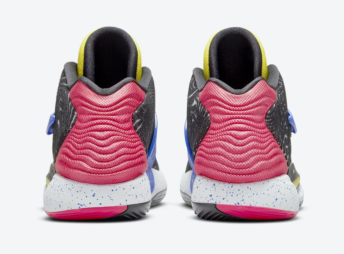 Autour de la tige en noir et blanc, on retrouve en effet une sangle bleu foncé marqué d'un « Swoosh » jaune, une languette en jaune sur lequel le logo « KD » ressort en bleu, et enfin, toute la surface du talon en rouge, pour accompagner la semelle intermédiaire en blanc « moucheté ». Un signe Nike apparaît également en rouge sur l'avant de la chaussure.