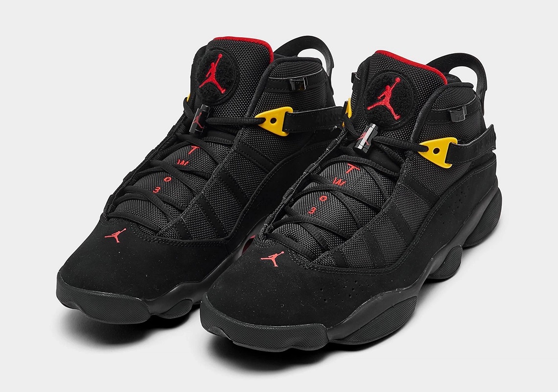 Sur une base ressemblant à la Air Jordan 11, cette Air Jordan 6 rings « Last shot » empreinte donc une palette identique à celle de la paire portée portée par MJ lors de ce moment historique. Avec une tige habillée de nuances de noir, des œillets jaunes et quelques touches de rouge vif, sur le « Jumpman » ou à l’intérieur de la languette. L’ensemble est sobre, mais efficace !