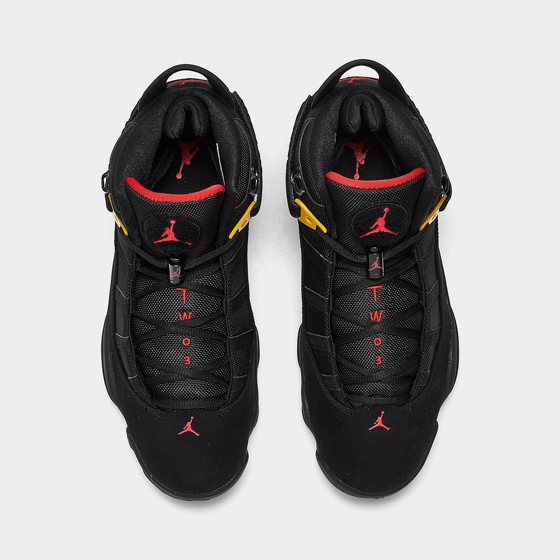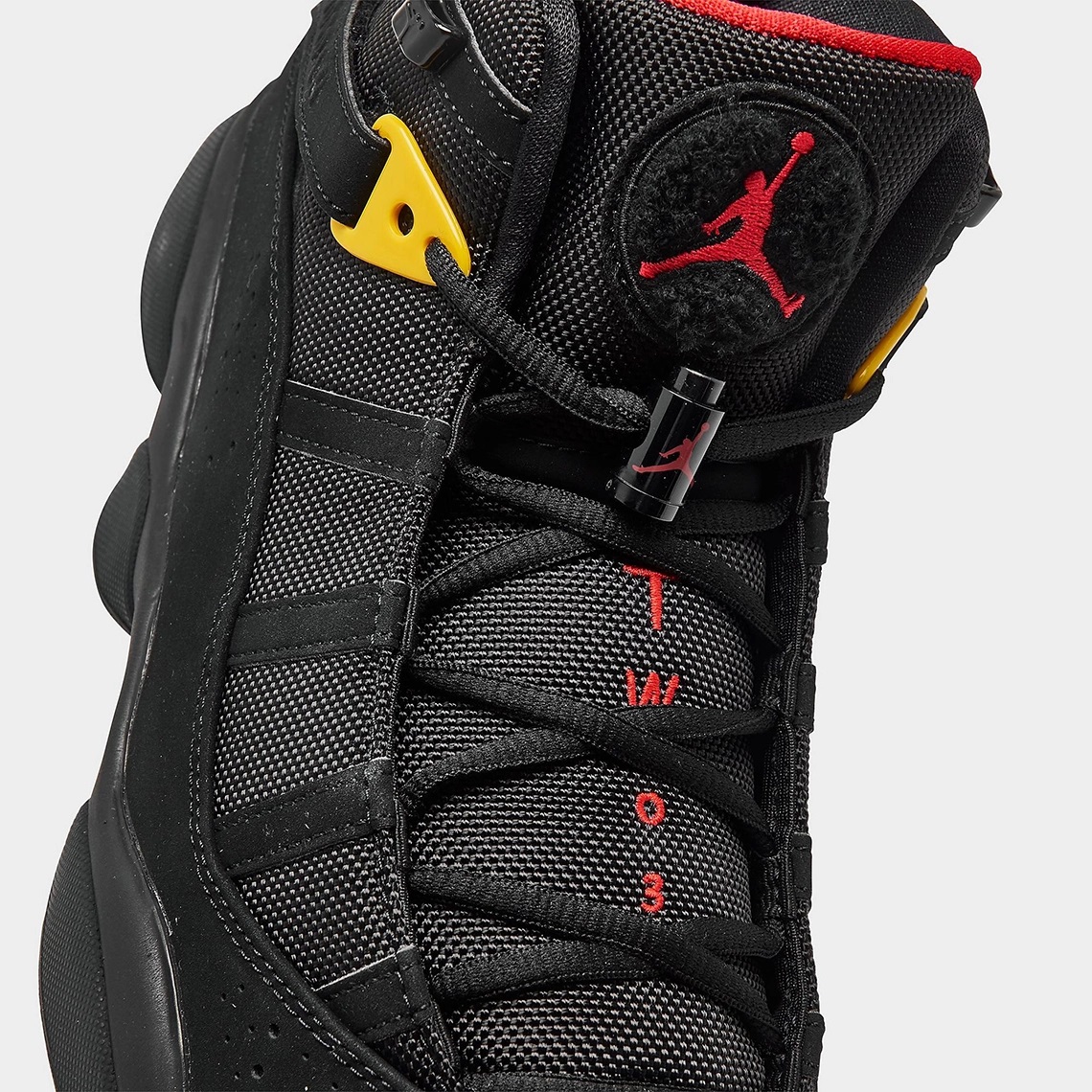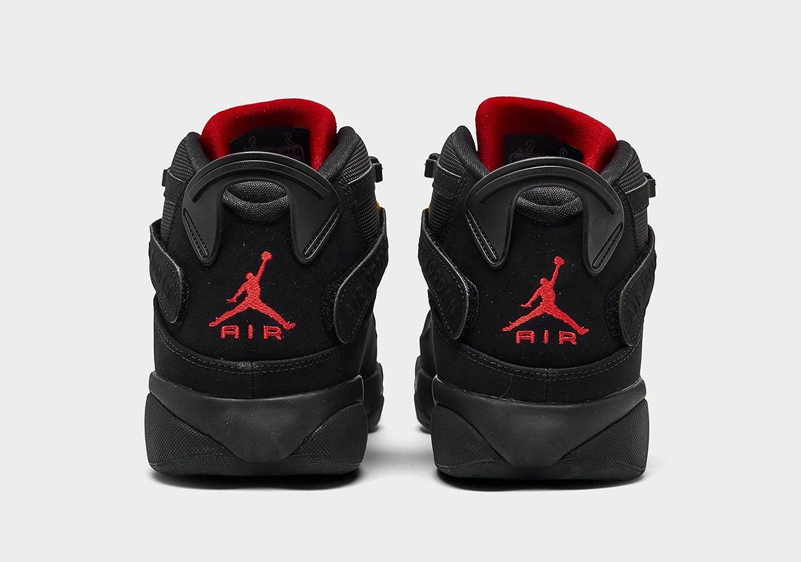Sur une base ressemblant à la Air Jordan 11, cette Air Jordan 6 rings « Last shot » empreinte donc une palette identique à celle de la paire portée portée par MJ lors de ce moment historique. Avec une tige habillée de nuances de noir, des œillets jaunes et quelques touches de rouge vif, sur le « Jumpman » ou à l’intérieur de la languette. L’ensemble est sobre, mais efficace !