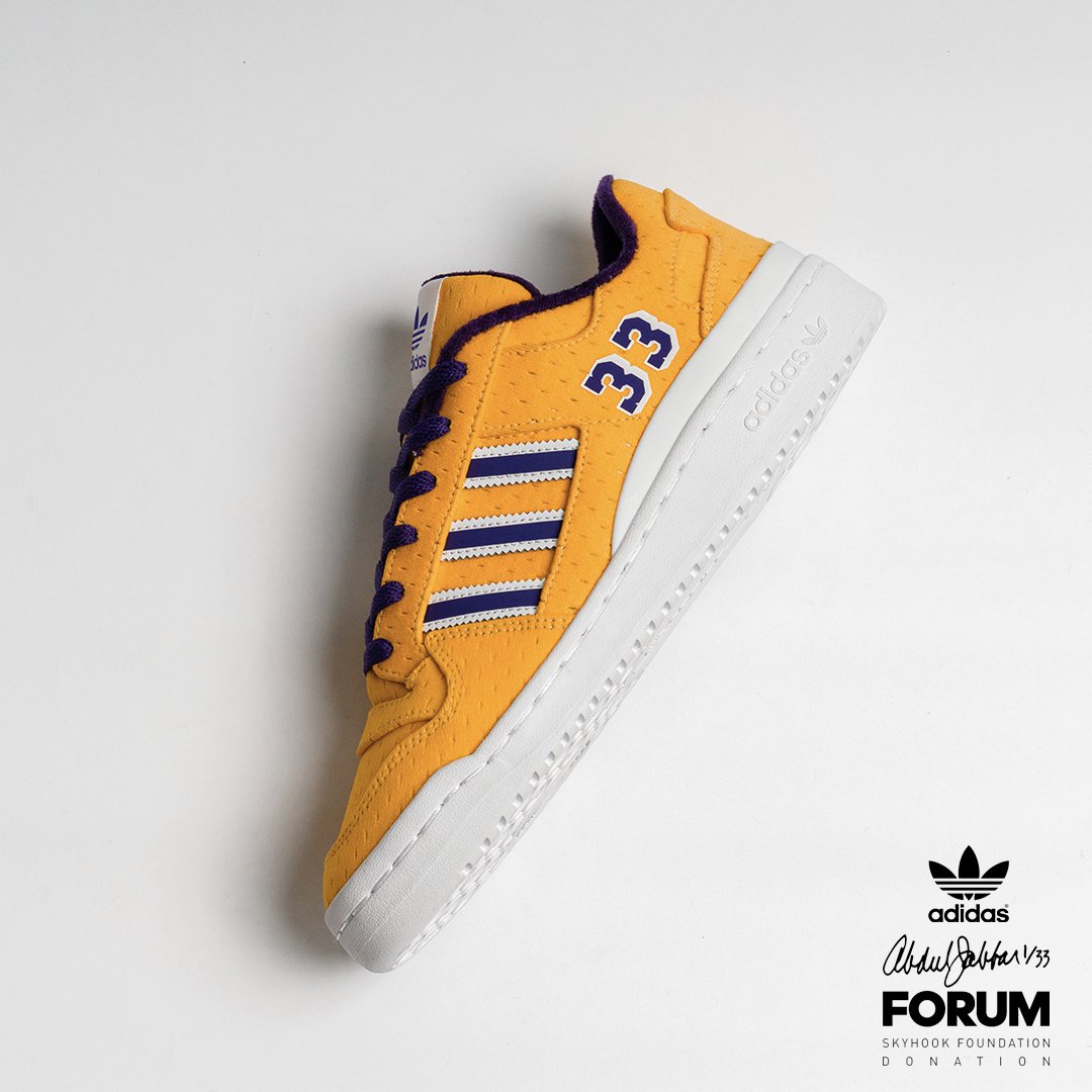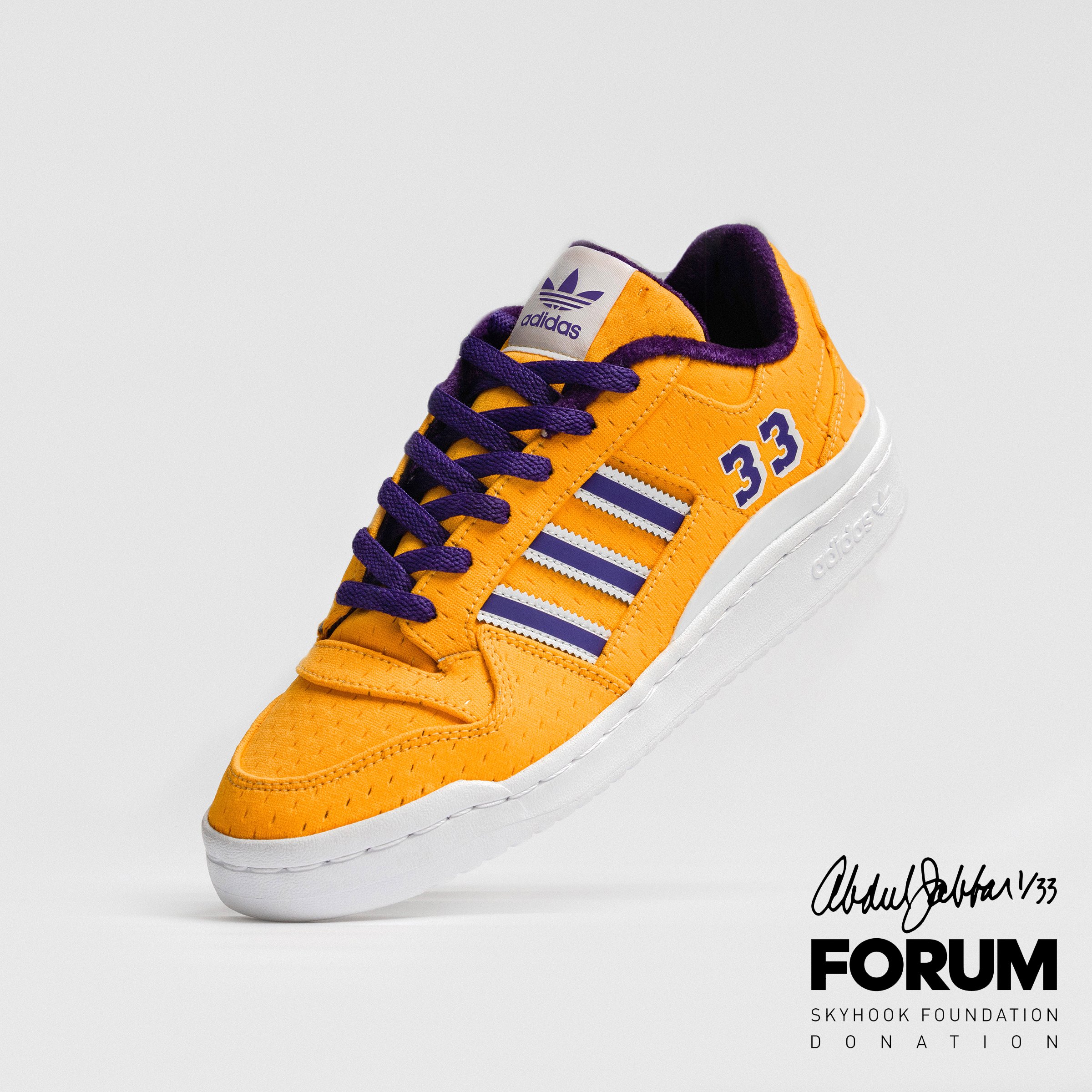 Adidas a en effet dessiné une Forum aux couleurs des Lakers avec une tige dont la matière est censé représenter le revêtement des maillots de l’époque. Le numéro 33 figure en évidence sur cet ensemble « Purple-and-Gold » doté d’une semelle entièrement blanche.