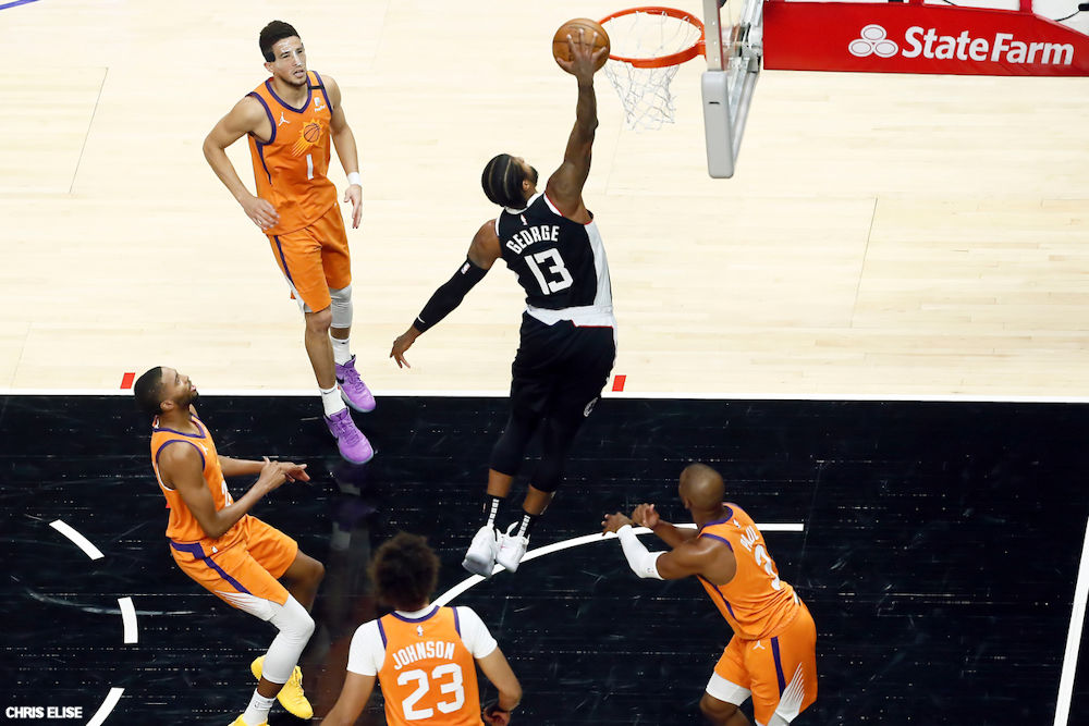Aux côtés de Paul George, Ivica Zubac (15 points, 16 rebonds) et Reggie Jackson (23 points) font partie de six autres Clippers qui ont marqué 8 points ou plus. Patrick Beverley a aussi tenu Devin Booker, qui portait un masque pour protéger son nez, à seulement 5 sur 21 aux tirs. Chris Paul (15 points, 5/19 aux tirs, 12 passes), de retour, a lui aussi manqué de rythme et son remplaçant, Cam Payne, excellent lors des deux premiers matchs, a dû quitter ses partenaires en fin de premier quart-temps après s’être tordu la cheville gauche.