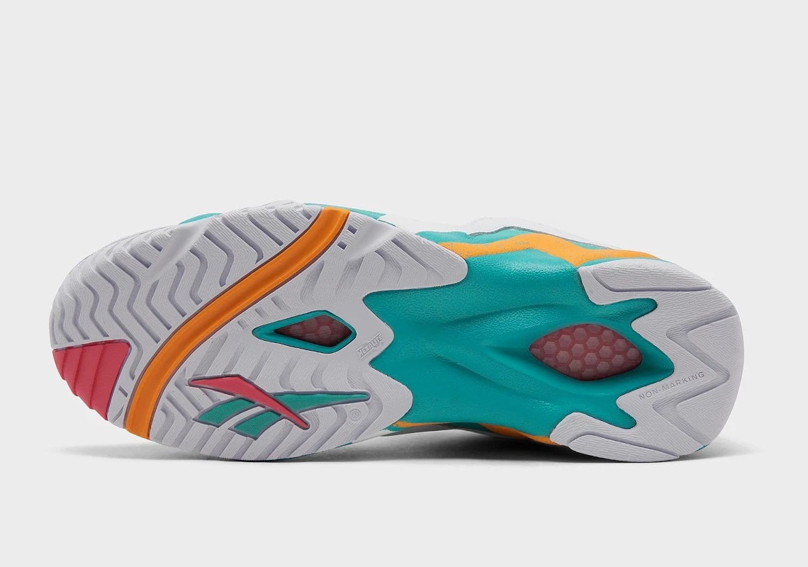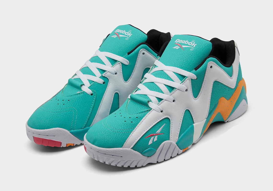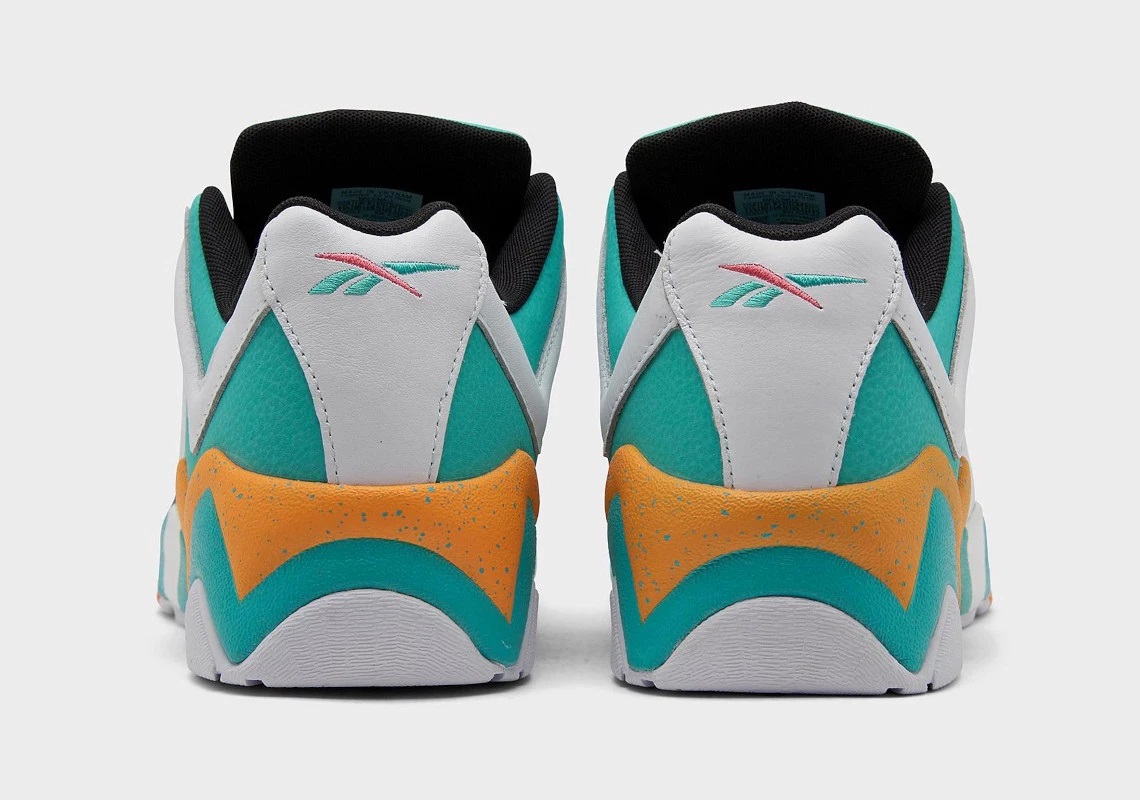Voilà un modèle hommage réussi ! La Reebok Kamikaze II Low va s’afficher aux couleurs bleues « aqua », blanches et oranges, reprenant les coloris utilisés par les Miami Dolphins. La base en cuir est habillée d’un bleu cyan-turquoise recouverte par une bande blanche. La même bande apparaissant sur la semelle intermédiaire ressort quant à elle en orange, moucheté de bleu.