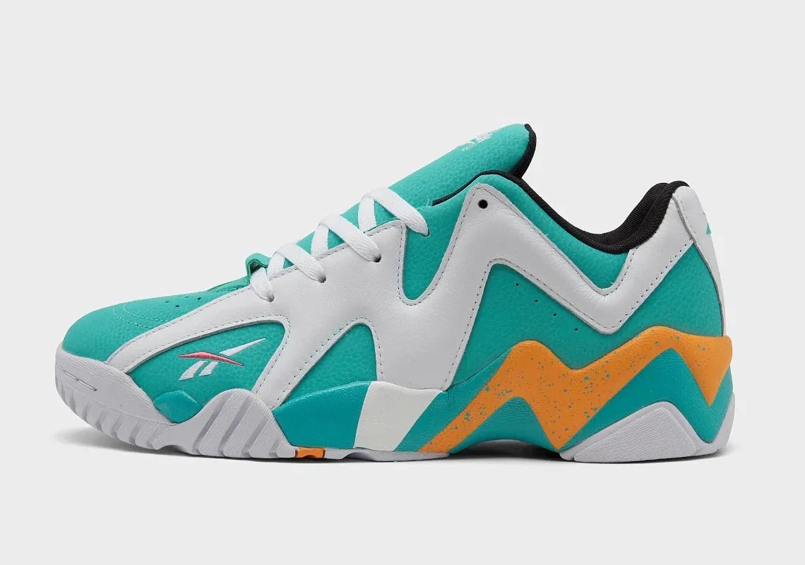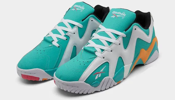Voilà un modèle hommage réussi ! La Reebok Kamikaze II Low va s'afficher aux couleurs bleues « aqua », blanches et oranges, reprenant les coloris utilisés par les Miami Dolphins. La base en cuir est habillée d'un bleu cyan-turquoise recouverte par une bande blanche. La même bande apparaissant sur la semelle intermédiaire ressort quant à elle en orange, moucheté de bleu.