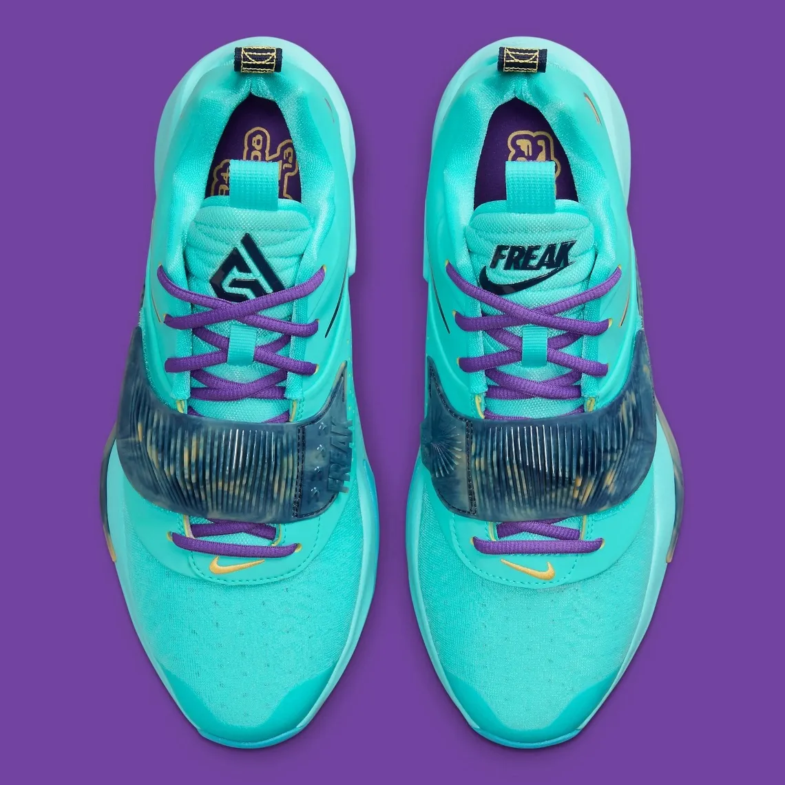 Le turquoise domine la majeure partie de la paire, avec une sangle et des logos du joueur et de « Freak » écrit sur la languette en bleu foncé, des lacets en violet, une virgule en noir d'un côté et les contours de la virgule qui ressortent en noir et jaune de l'autre. Annoncée à 120 dollars, cette nouvelle version devrait être disponible dans les mois à venir, en espérant que Giannis Antetokounmpo soit remis sur pieds d'ici là.