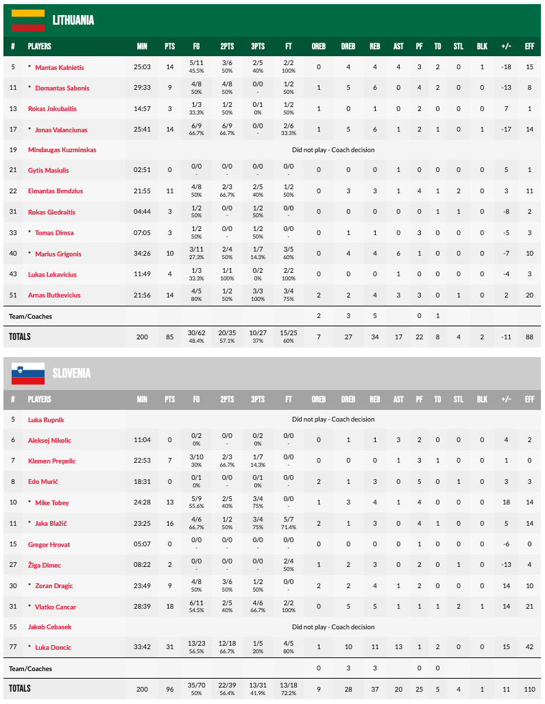 Après une première mi-temps de haute volée, dont un Luka Doncic déjà en transe à 21 points à 9/14 aux tirs, plus 6 rebonds et 5 passes pour 26 d’évaluation (!), la Slovénie a fait la différence avec son culot habituel, mais aussi en tenant parfaitement le choc défensivement face au duo Jonas Valanciunas (14 points, 6 rebonds) et Domantas Sabonis (9 points, 6 rebonds).