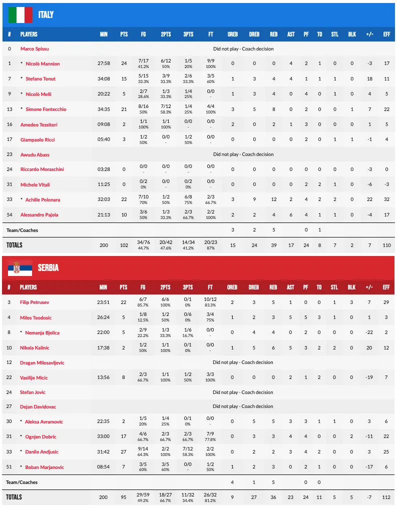 Les shooteurs transalpins, à l'image d'Achille Polonara, démarrent fort la rencontre et mènent 28-22 à la fin du premier quart-temps. Peu rassurante depuis le début du TQO, la Serbie se retrouve à courir après le score mais Danilo Andjusic répond aux shooteurs adverses derrière la ligne à 3-points, et Belgrade respire mieux.
