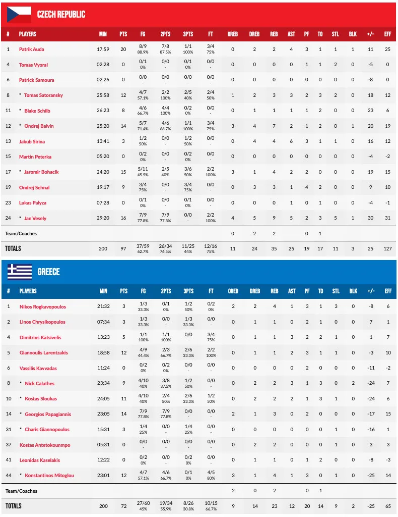 Équipe surprise du Mondial 2019, la République tchèque confirme qu'elle fait partie des meilleures nations mondiales, et aux côtés de Satoransky (12 pts, 3 rbds et 3 pds), le plus en vue est Jan Vesely. Discret jusque-là dans la compétition, le MVP de l'Euroleague 2019 compile 16 pts, 9 rbds, 5 pds et 5 ints.