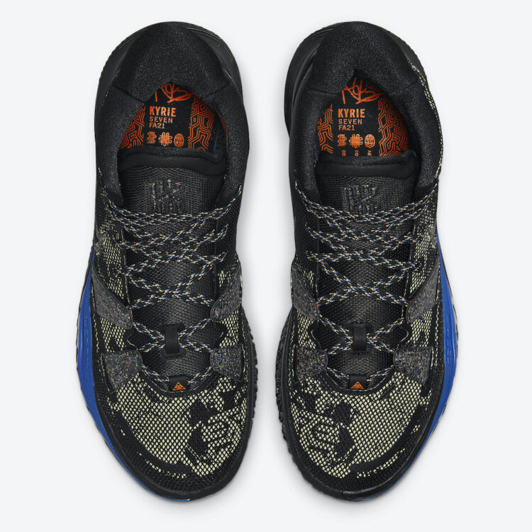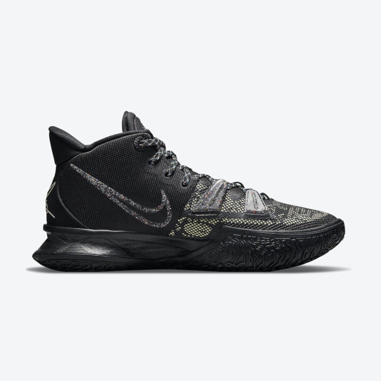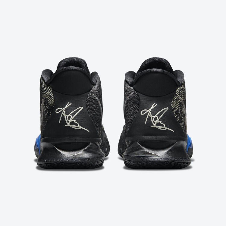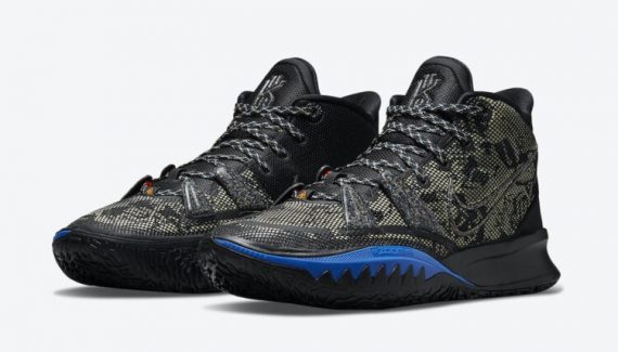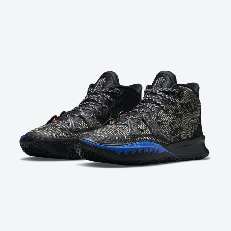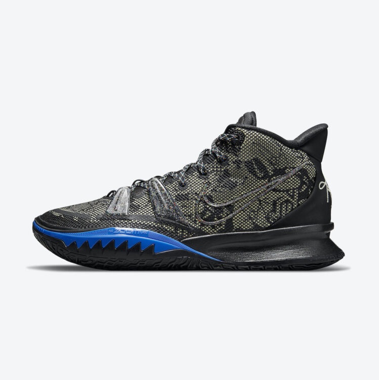 Comme la Cosmic Unity, cette Kyrie 7 aux tons noir, vert olive et marquée d’une bande bleue sur la semelle intermédiaire a également été conçue de la sorte. Avec une base en mesh noir et couverts de motif « olive », une languette et une semelle en caoutchouc noir, sur lequel ressort le logo de Kyrie Irving. Sa signature apparaît également au niveau du talon.