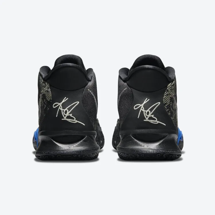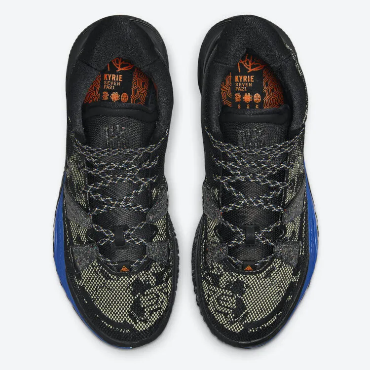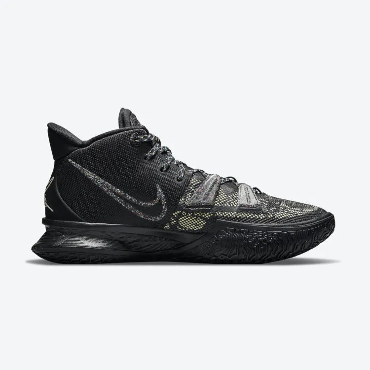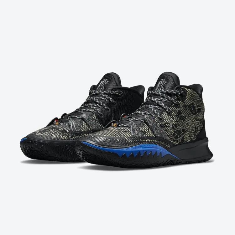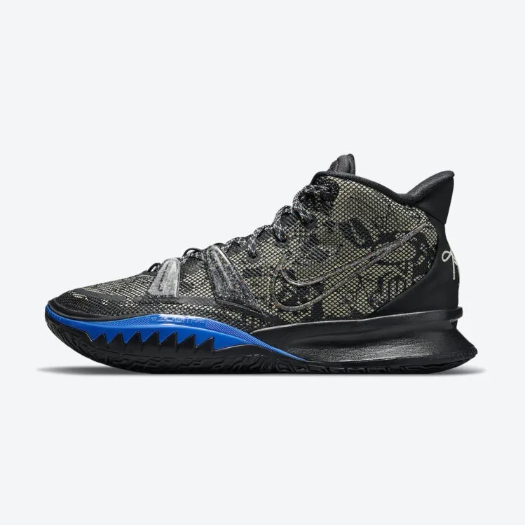 Comme la Cosmic Unity, cette Kyrie 7 aux tons noir, vert olive et marquée d'une bande bleue sur la semelle intermédiaire a également été conçue de la sorte. Avec une base en mesh noir et couverts de motif « olive », une languette et une semelle en caoutchouc noir, sur lequel ressort le logo de Kyrie Irving. Sa signature apparaît également au niveau du talon.