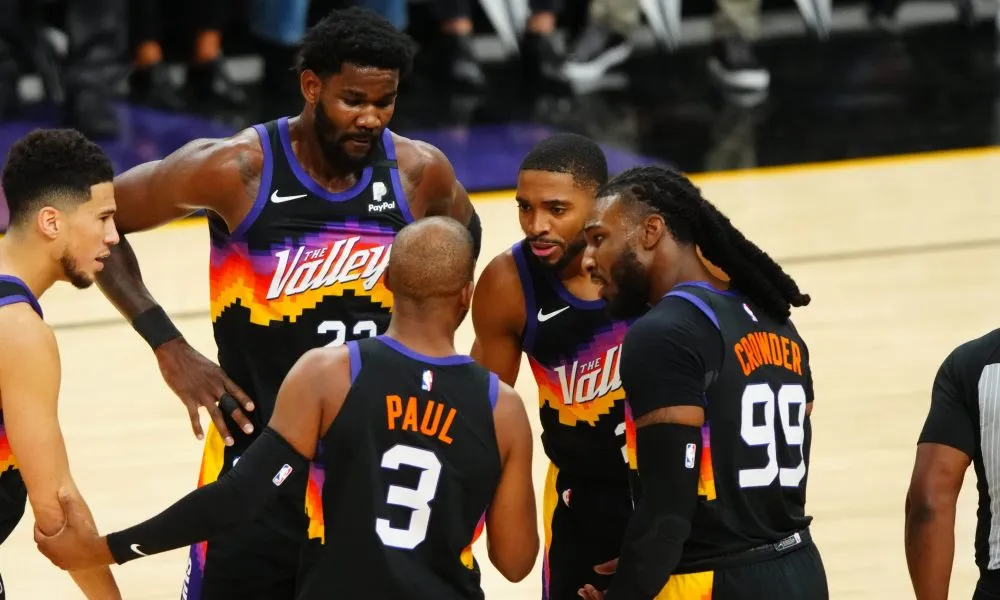 Le cinq de départ : C. Paul, D. Booker, M. Bridges, J. Crowder, D. Ayton.