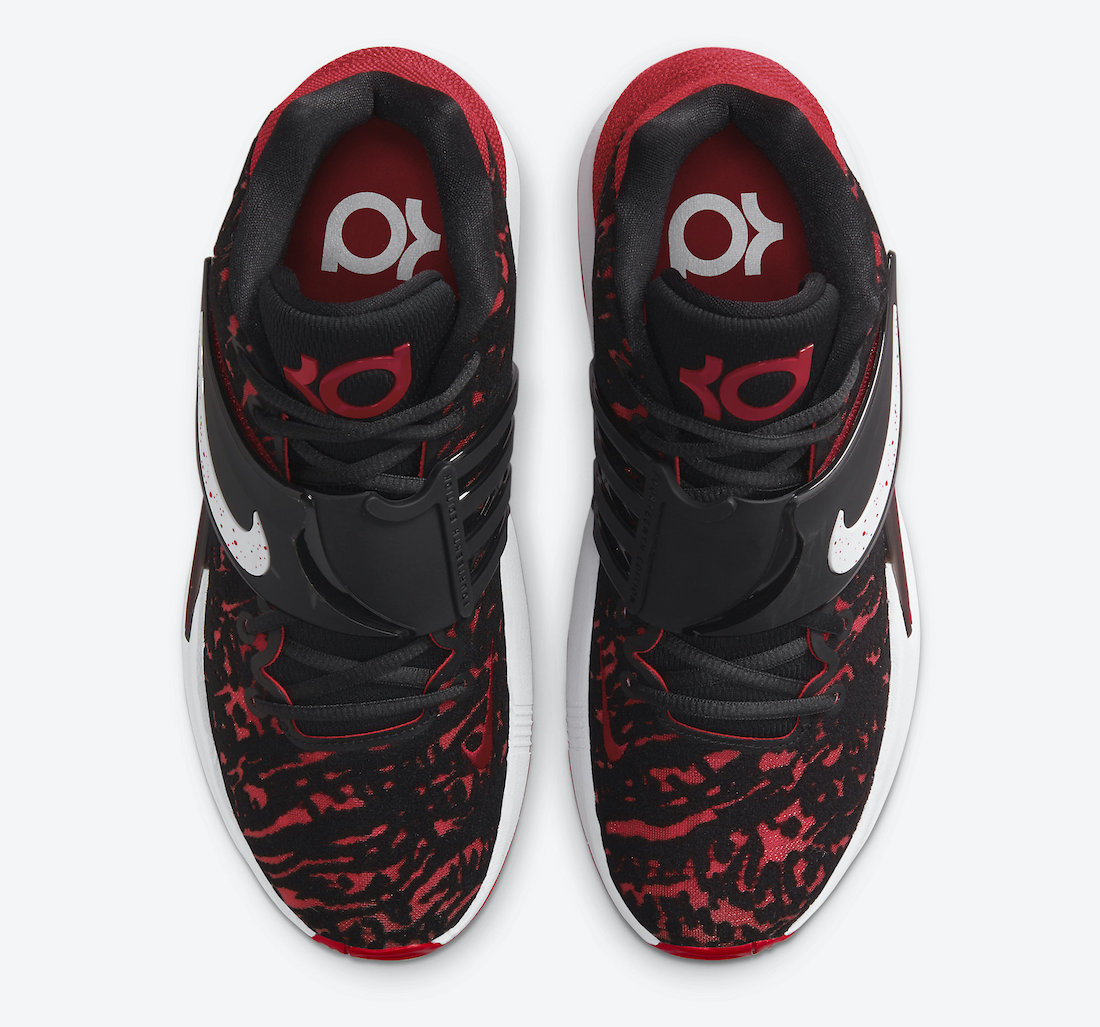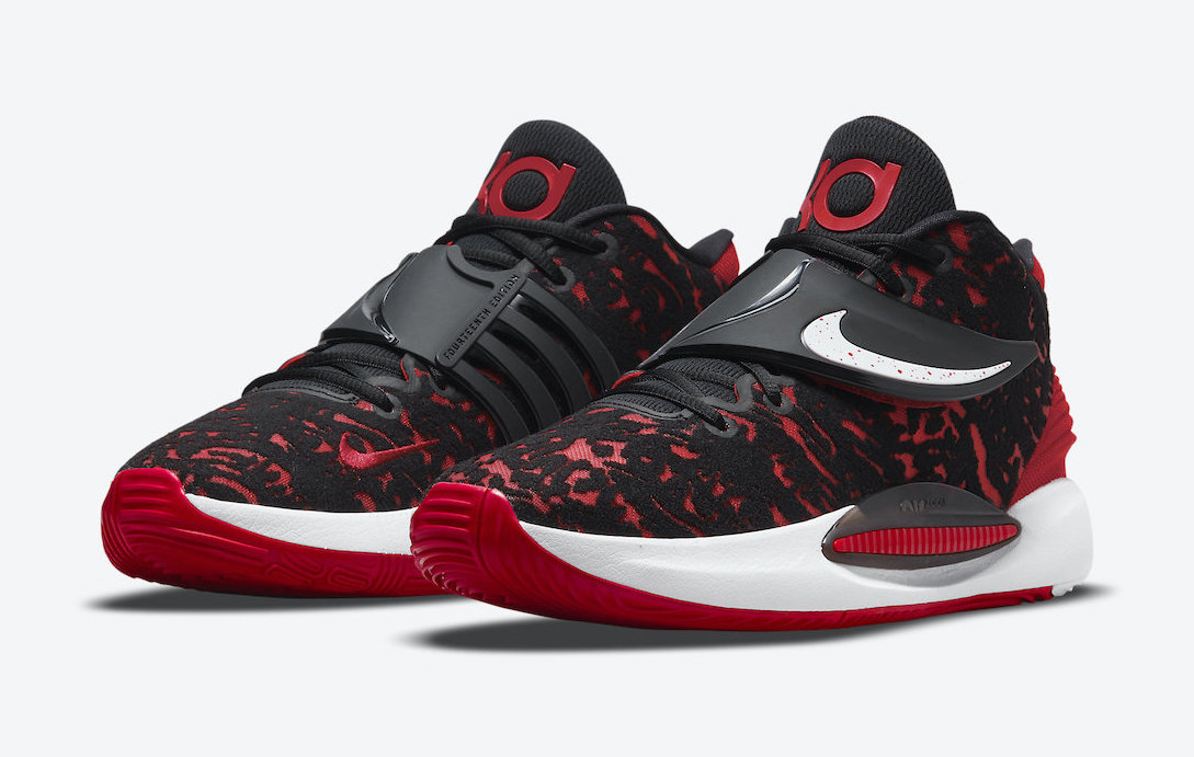 « Bred » pour « Black-and-Red », tel est le code utilisé par Nike pour ses modèles majoritairement rouge et noir comme c’est le cas du nouveau coloris de la KD 14, avec la tige, le talon, la languette et la sangle qui utilisent ces couleurs. Seuls le « Swoosh », sur la sangle, et la semelle intermédiaire apparaissent en blanc.