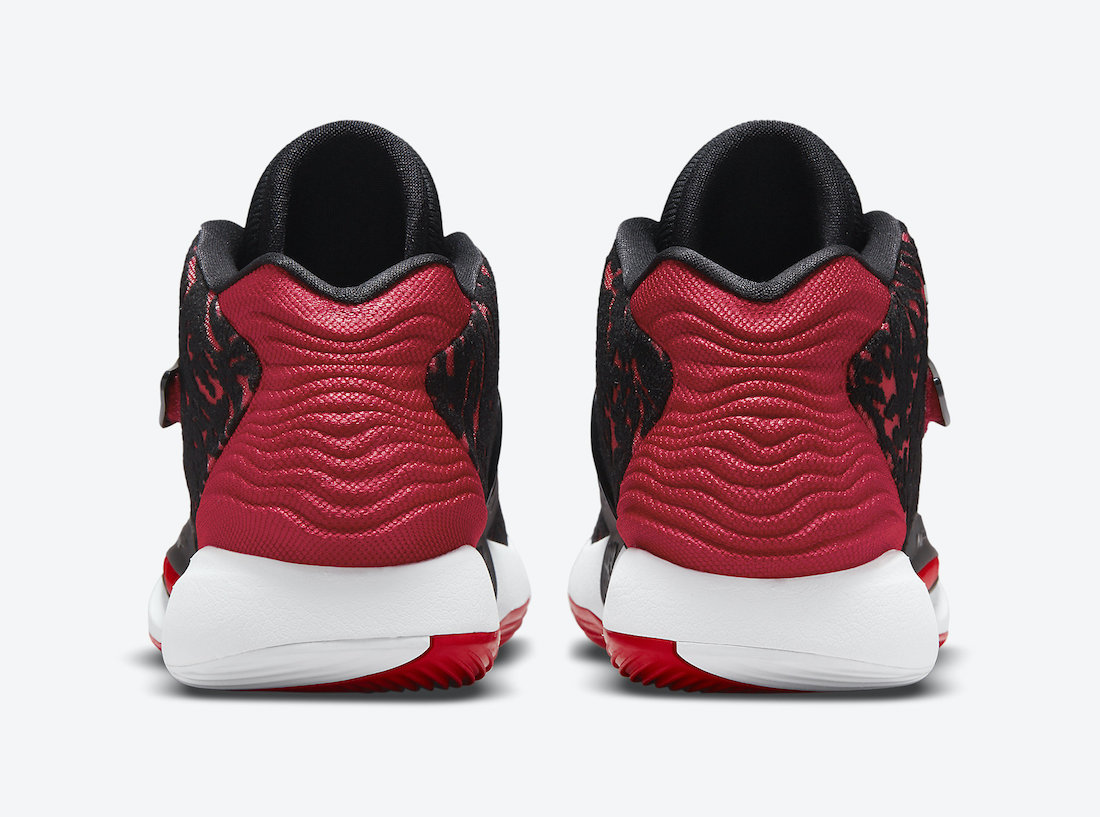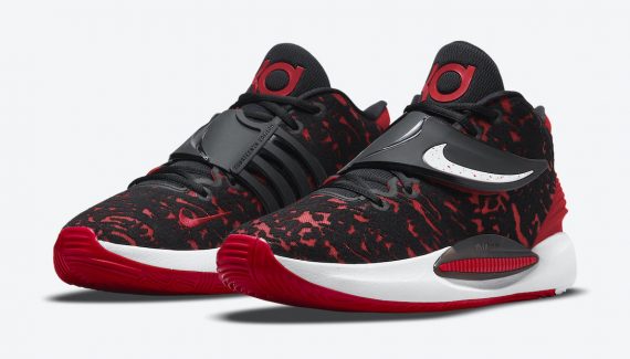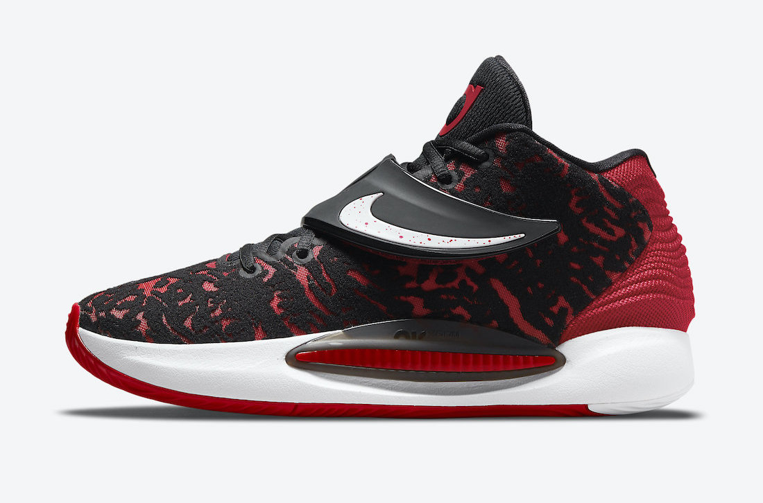 « Bred » pour « Black-and-Red », tel est le code utilisé par Nike pour ses modèles majoritairement rouge et noir comme c’est le cas du nouveau coloris de la KD 14, avec la tige, le talon, la languette et la sangle qui utilisent ces couleurs. Seuls le « Swoosh », sur la sangle, et la semelle intermédiaire apparaissent en blanc.