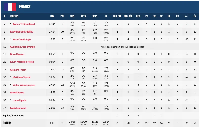 Clément Frisch file lui au dunk sur une interception qui laisse Holmgren au sol. Wembanyama place alors un troisième puis un quatrième contre, alors que la France fait un petit écart aux lancers, après une faute antisportive sur une nouvelle interception française. Patrick Baldwin Jr. limite la casse pour Team USA mais Victor Wembanyama en remet une couche, avec un énorme tir en ligne de fond, plus la faute !