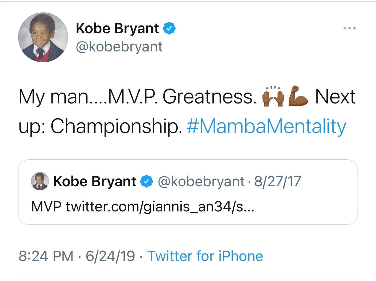 En 2017, l'ailier-fort des Bucks prend son clavier, et demande : “J'attends mon défi, Kobe“. Et le “Black Mamba” de lui répondre : “MVP”.